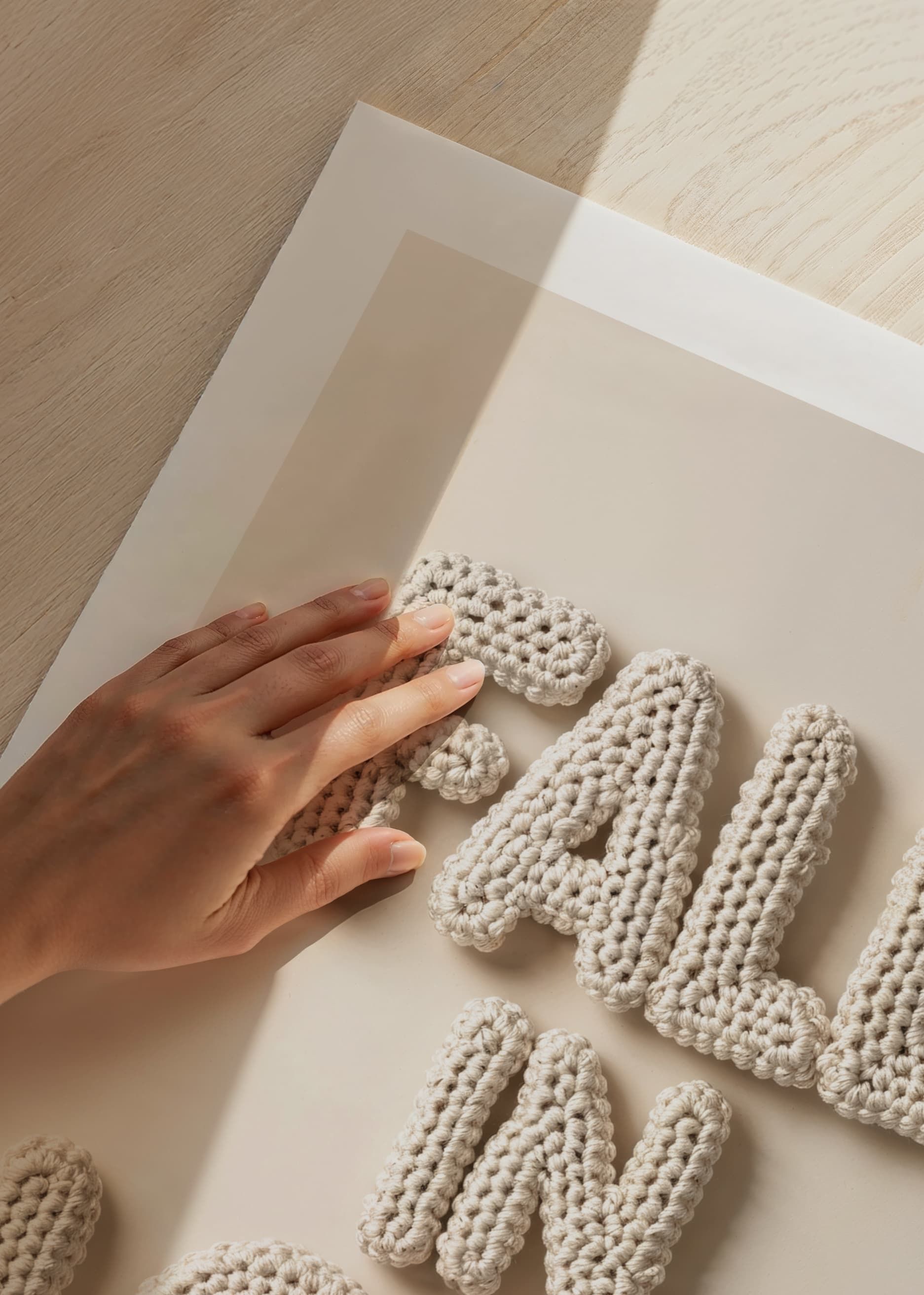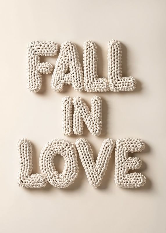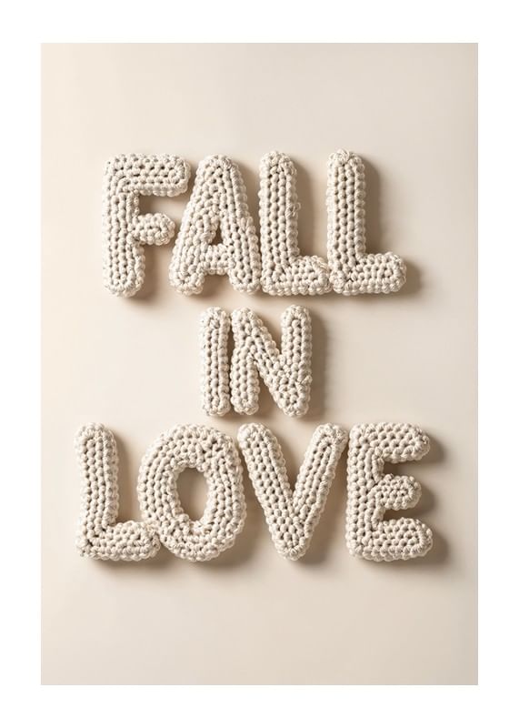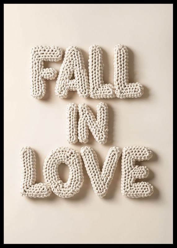 This poster combines simplicity and warmth with its message "Fall in Love" formed by handmade crocheted letters. The soft, neutral tones and tactile texture give a sense of closeness and care, perfect for creating a homely and inviting atmosphere. An expression of love and coziness that fits both in the bedroom, the living room or as a loving detail in your home.