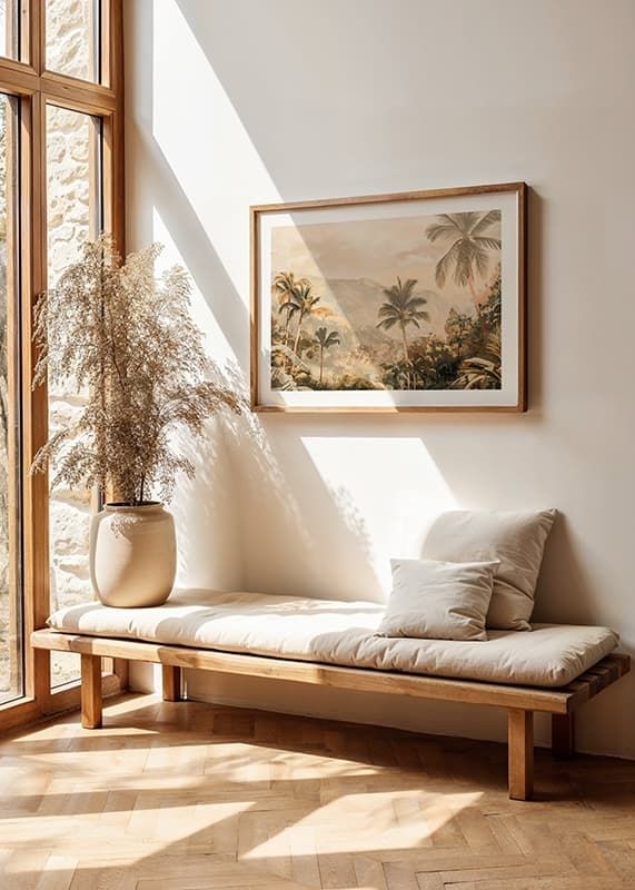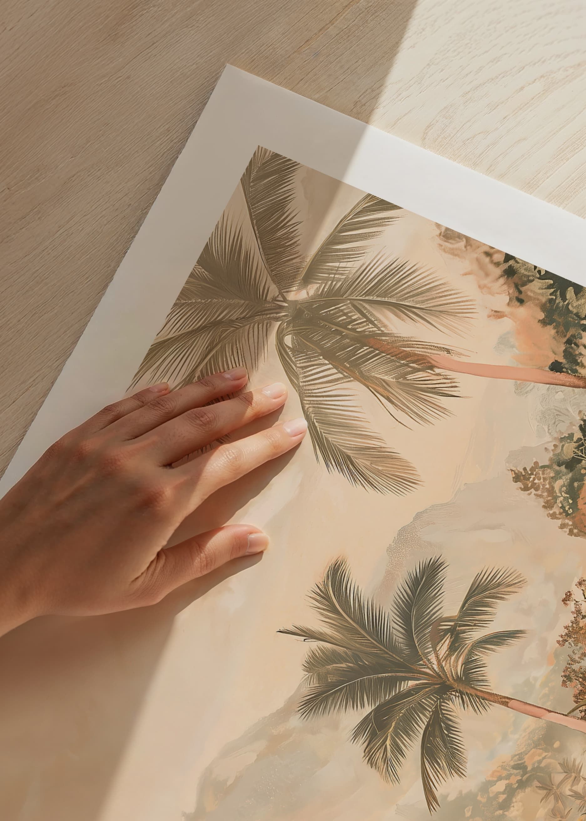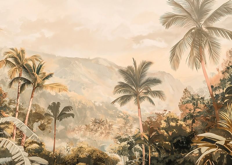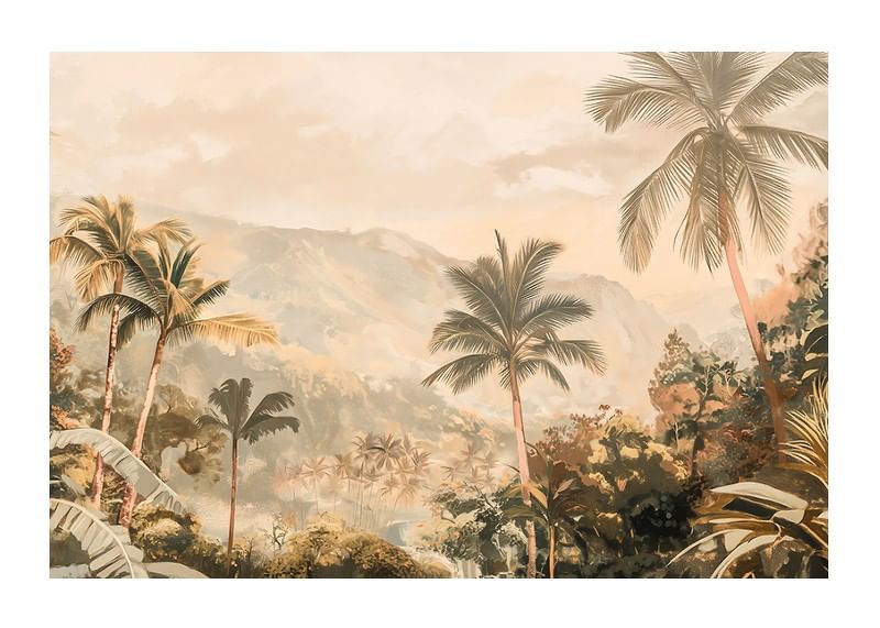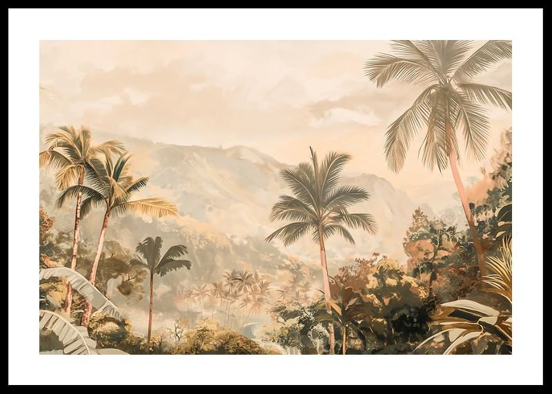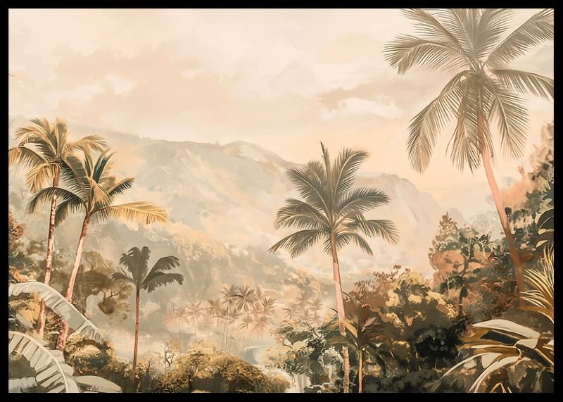 Let this harmonious poster transport you to an exotic world of swaying palm trees, lush greenery and mist-shrouded mountains in the distance. The soft golden tones create a warm and dreamy atmosphere, perfect for giving your home a sense of peace and adventure.
