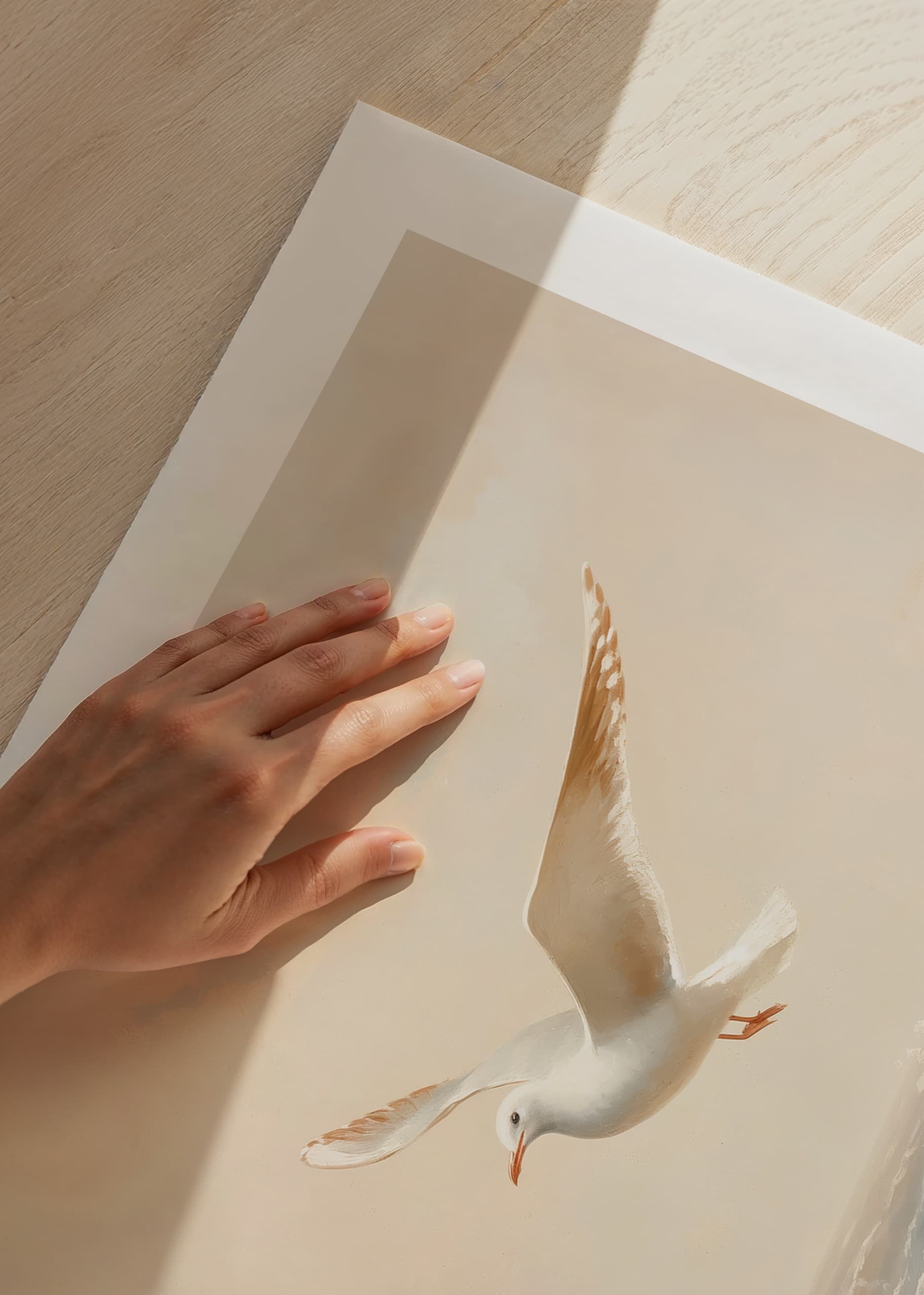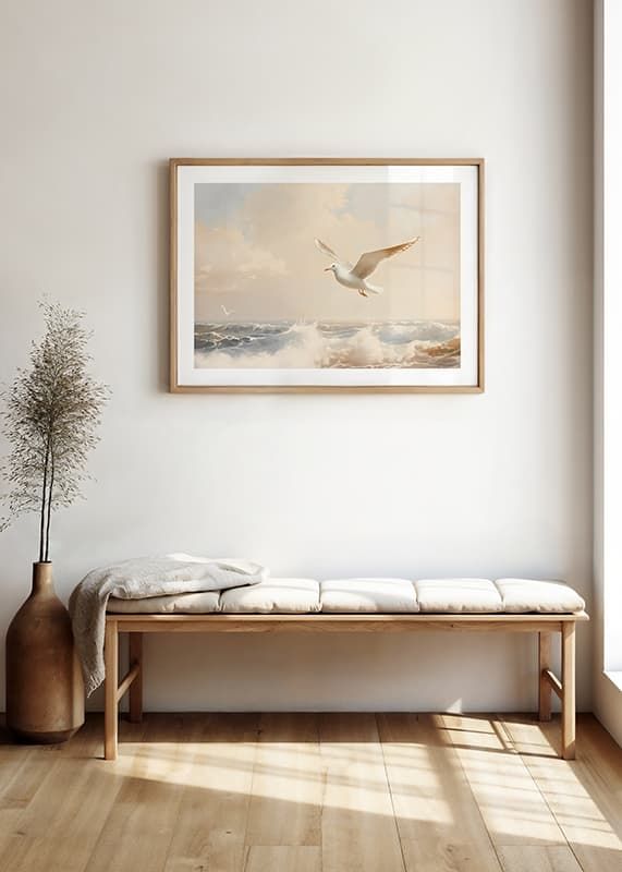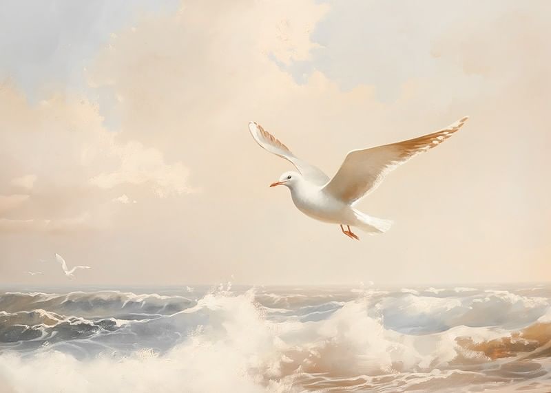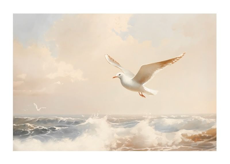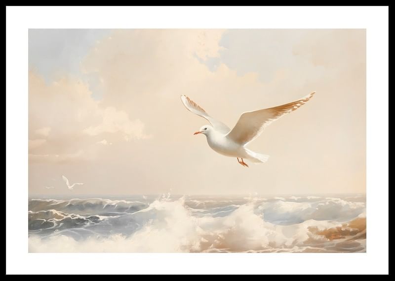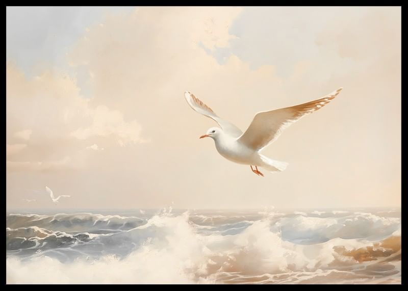 This beautiful poster captures a seagull in majestic flight over the foaming waves, surrounded by soft light and a dreamy sky. The image exudes freedom, tranquility and the infinite beauty of nature.