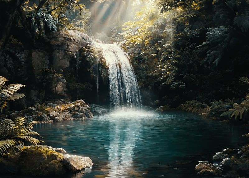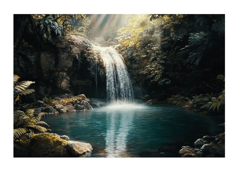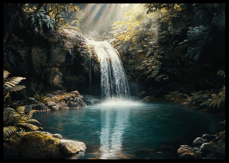 Let this magical poster transport you to a hidden oasis where a crystal clear waterfall cascades into an emerald green lagoon, surrounded by lush greenery. The sun's rays break through the jungle canopy, creating a dreamy and harmonious atmosphere.