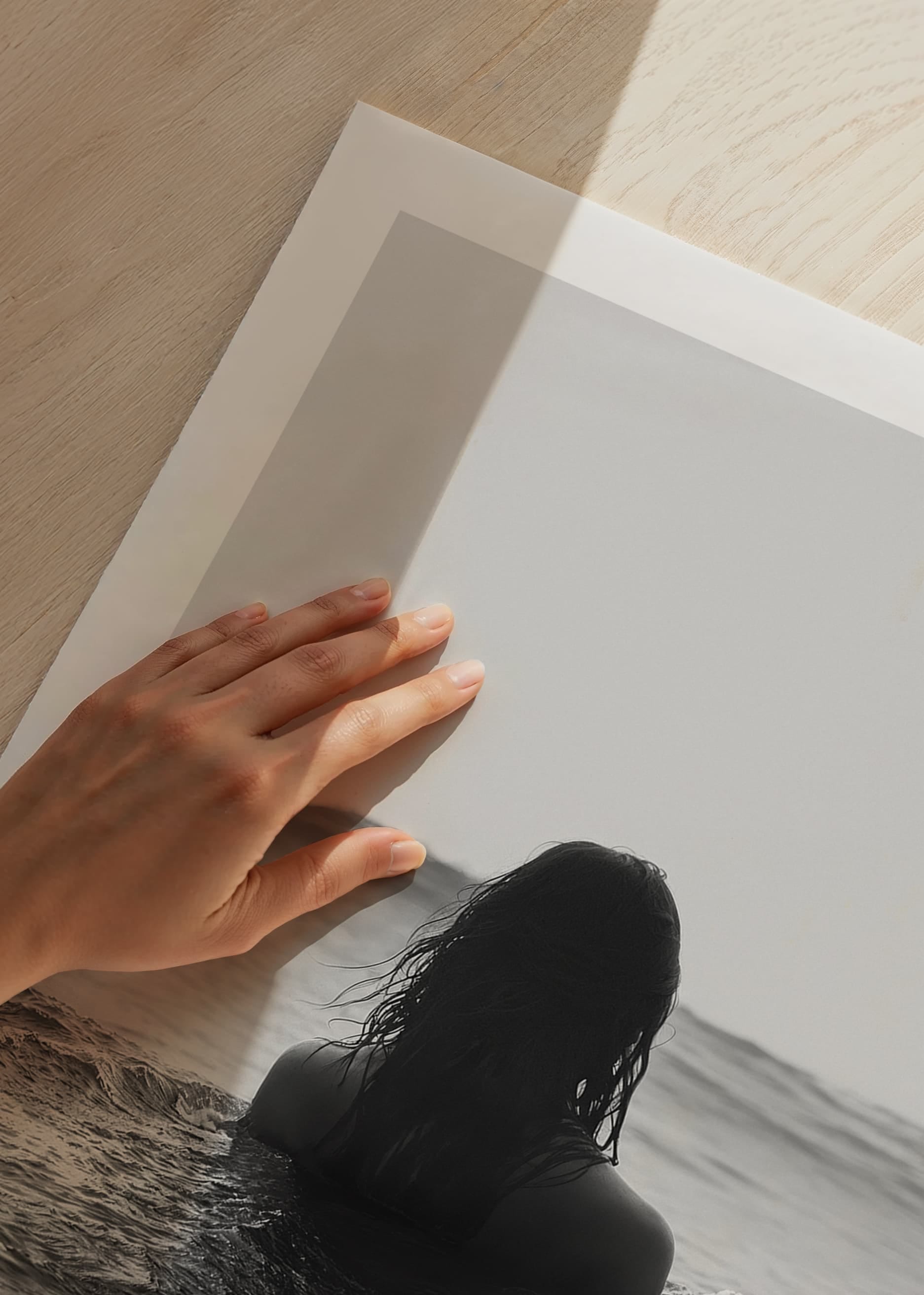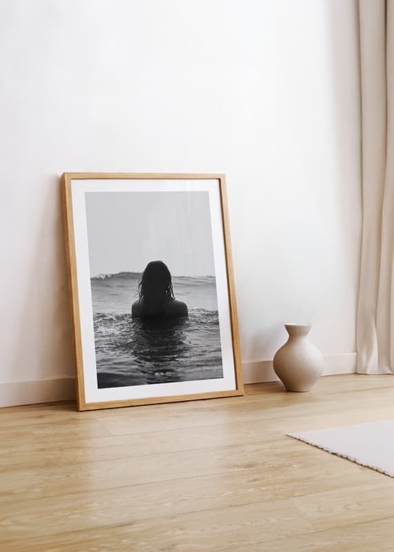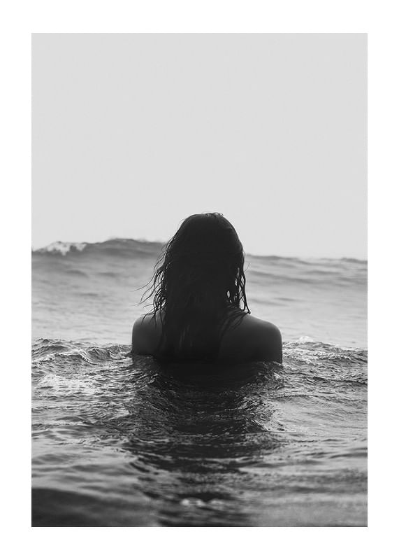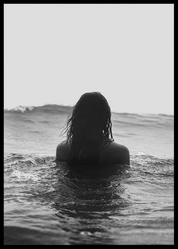 This poster captures a moment of deep reflection and freedom, where a person stands alone in the sea, with their gaze fixed on the horizon. The calm waves and the muted color palette create a feeling of calm and connection with nature. Perfect for decorating your home with an atmosphere of freedom and self-awareness, where every glance at the painting is a reminder of the power of embracing the unknown and finding peace in the present.