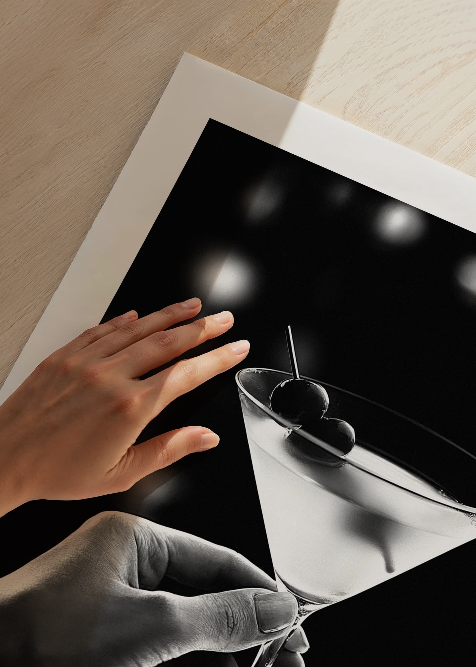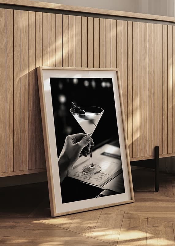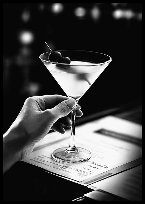 This stylish poster captures the essence of sophistication and indulgence with a close-up of a hand holding a classic martini glass, elegantly decorated with cherries. The black and white contrast creates a timeless atmosphere that exudes exclusivity and subtle elegance. Perfect for enhancing the feeling of luxury and finesse in your home, living room or bar corner, where every detail reflects a timeless taste and the art of pleasure.