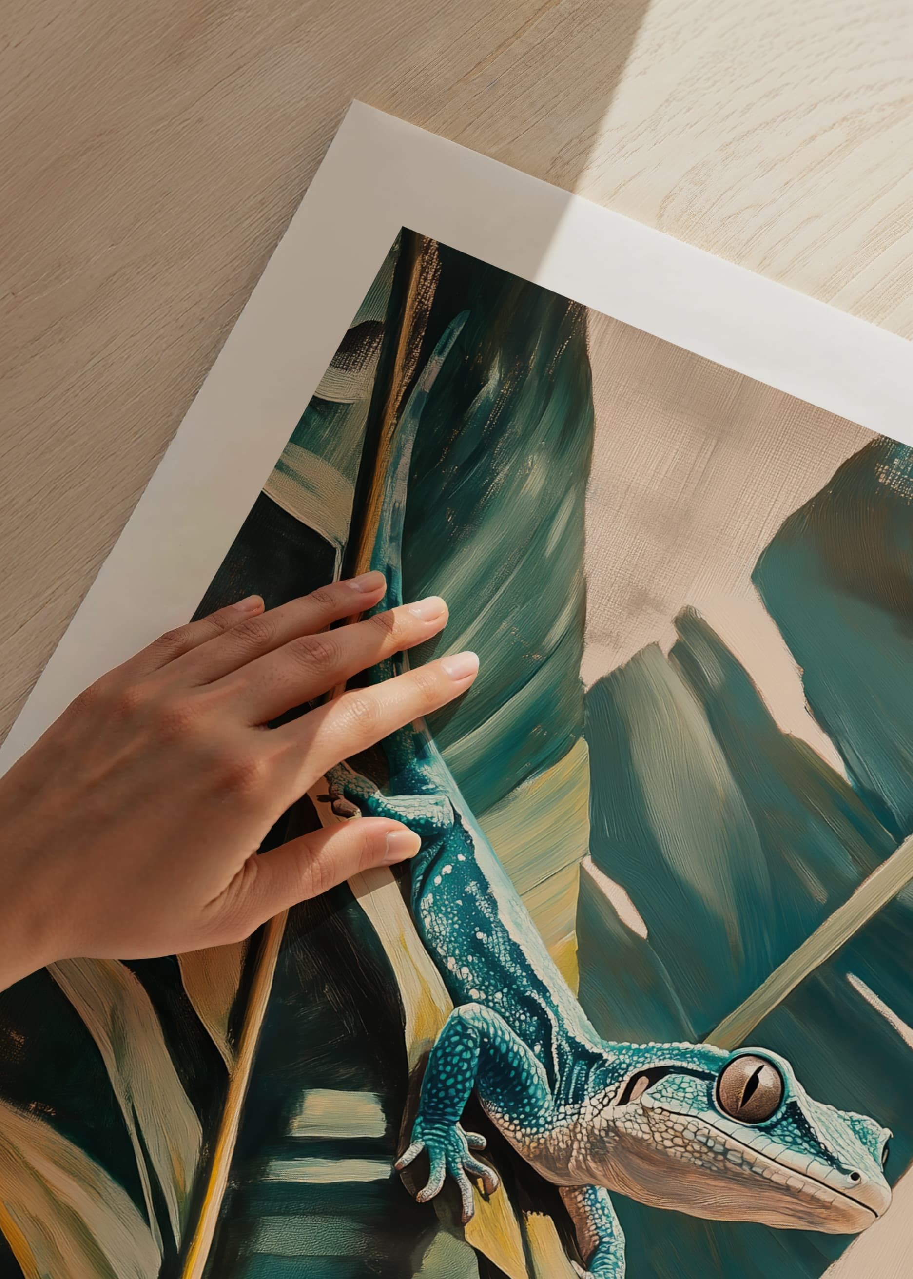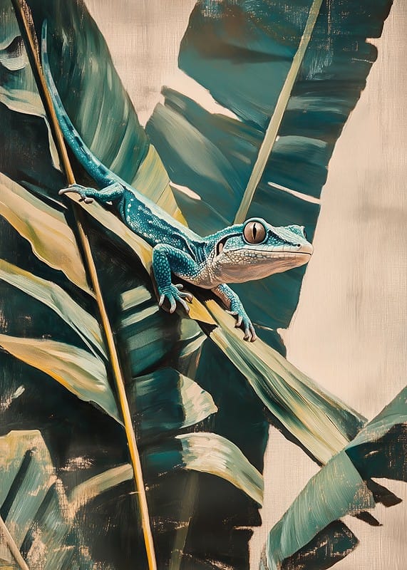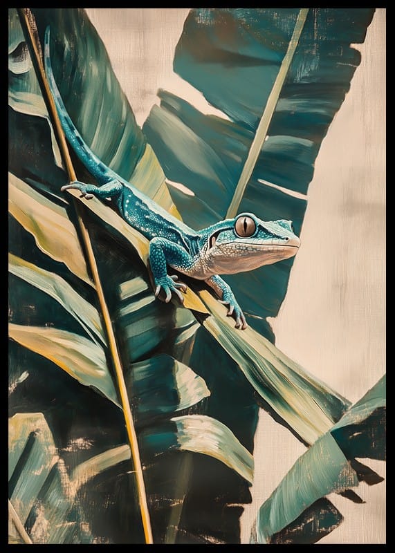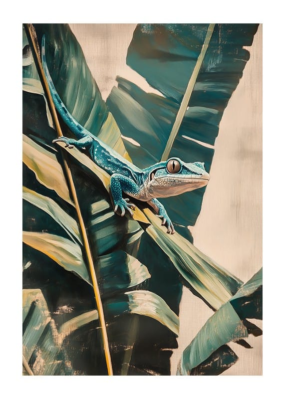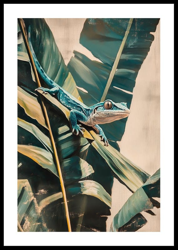 This mesmerizing poster captures an exotic lizard slinking across lush, verdant foliage. Its shimmering blue-green colors and intense gaze create a sense of mystery and adventure.
