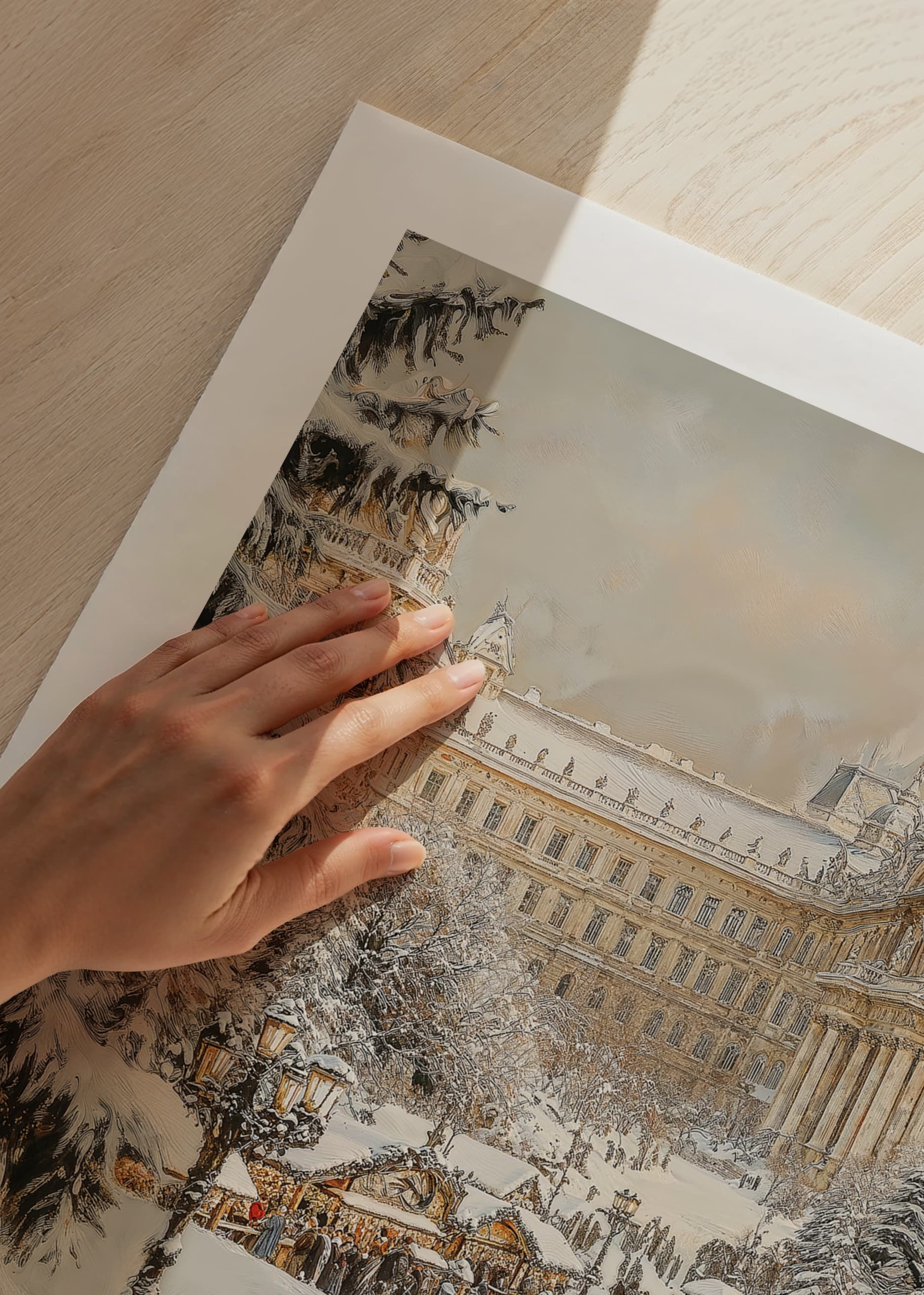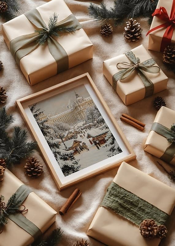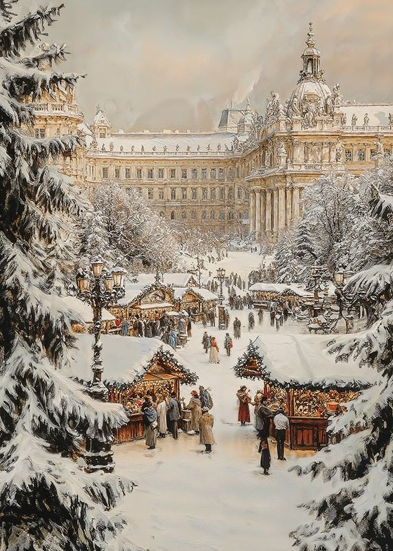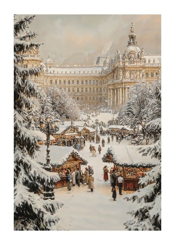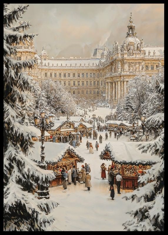 Experience the magic of Christmas with this atmospheric poster! The picture shows a classic Christmas market surrounded by snow-covered trees and historic buildings, where small wooden huts light up the winter darkness with their warm glow. Visitors stroll among the market stalls filled with Christmas decorations and goodies. This poster captures the festive atmosphere and is perfect for creating a sense of community and tradition in your home.