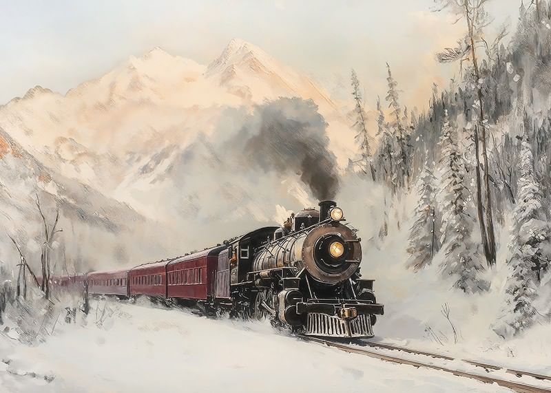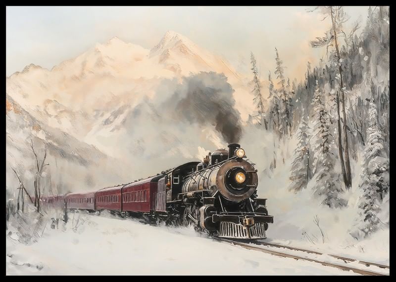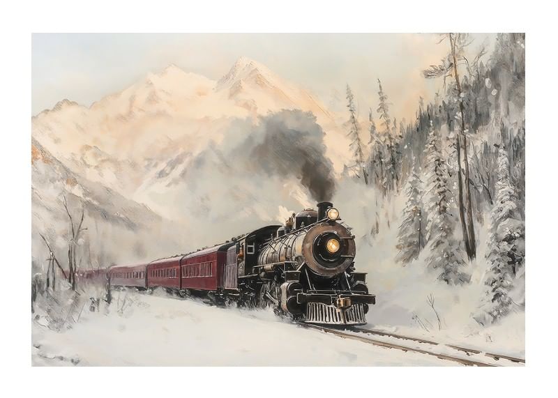 Take a nostalgic journey through the winter landscape with this poster depicting a majestic steam locomotive making its way through snow-capped mountains. The image captures both the adventure and magic of a winter journey, with smoke rising into the sky and snow covering the trees. Perfect for creating a sense of timelessness and a sense of discovery in your home, where every glance at the poster becomes like a journey to another time and place.