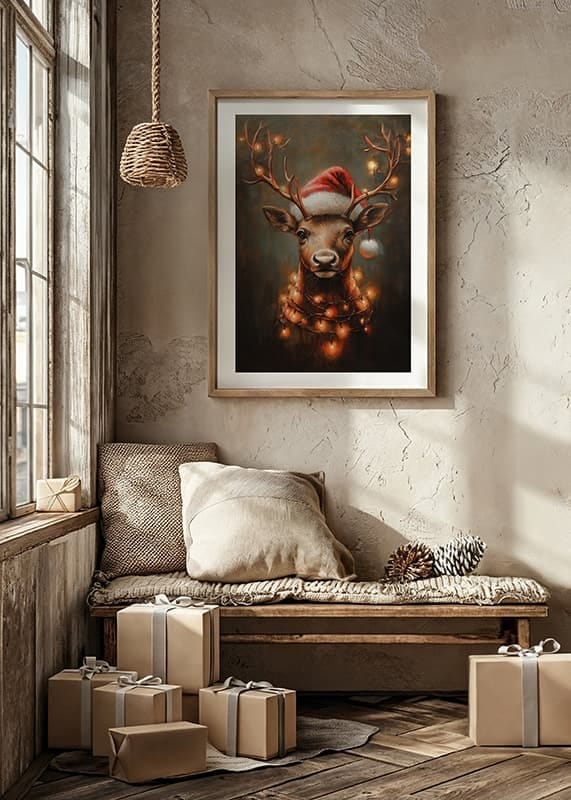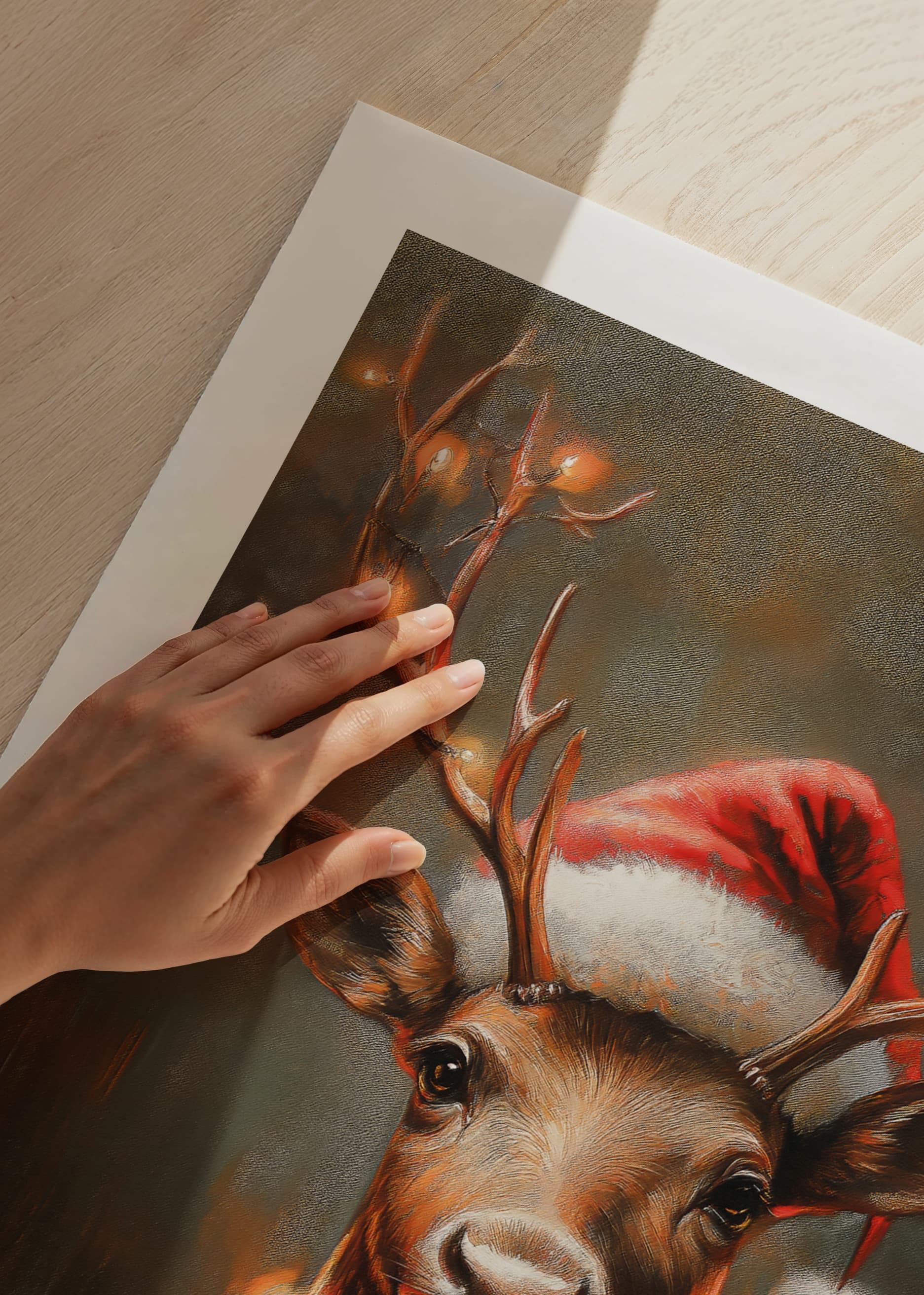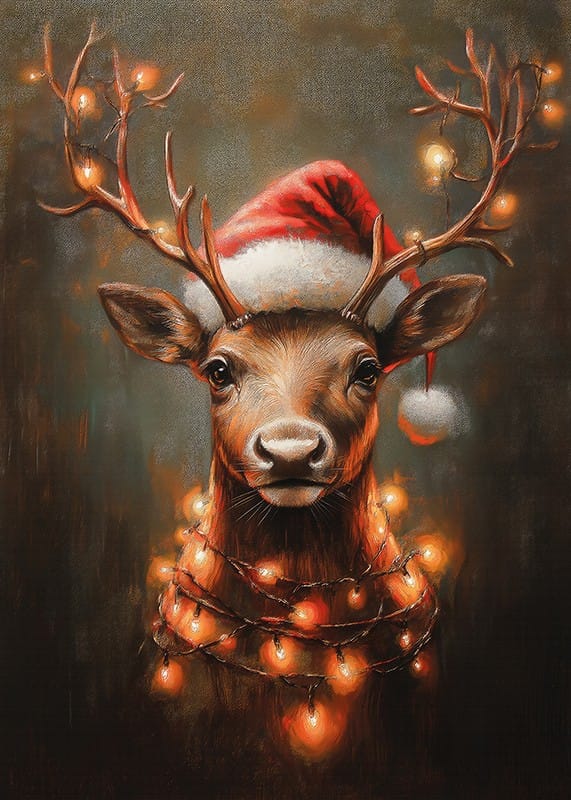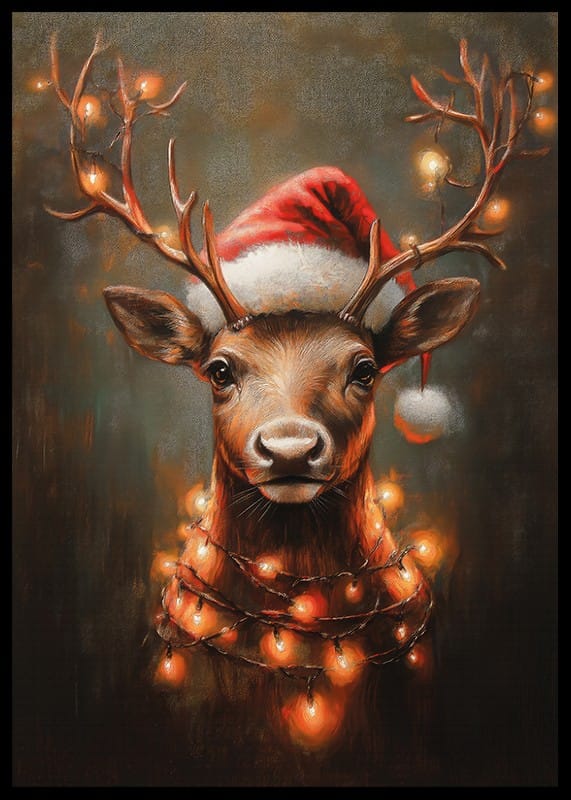 Spread the Christmas spirit with this charming poster that shows a clean dressed Santa hat, with strings of lights illuminating his majestic horns. The picture captures both warmth and humor, perfect for creating a festive feeling in your home during the holiday season. This unique reindeer with twinkling lights is a lovely reminder of the magic and joy of Christmas, a detail that spreads smiles and creates a welcoming atmosphere.