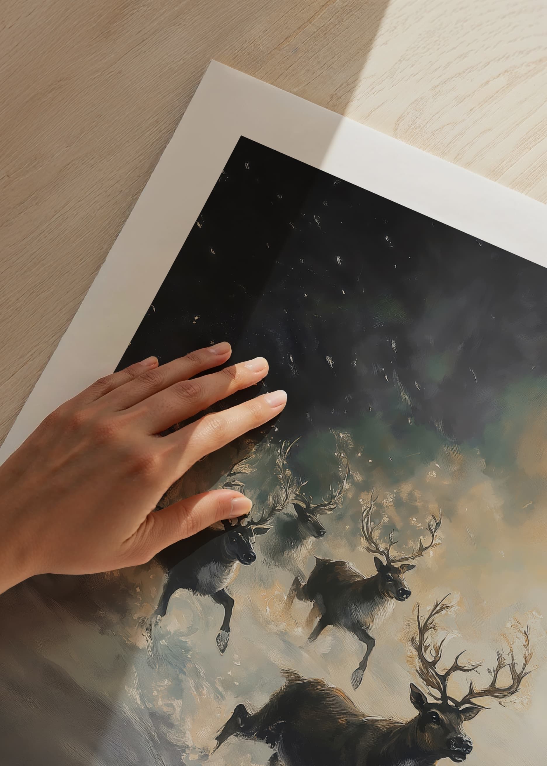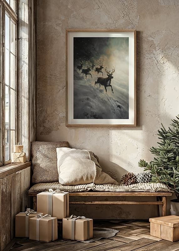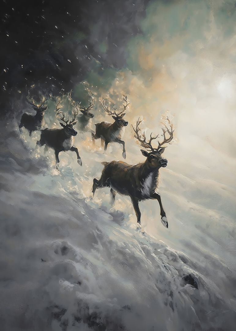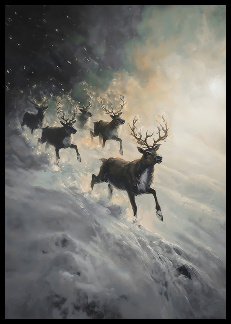 Fill your home with drama and winter mystery with this impressive poster depicting a herd of reindeer speeding down a snow-covered slope, surrounded by mist and soft light. The image captures the power of nature and the raw beauty of the Nordic landscape, where the reindeer appear as majestic symbols of freedom and strength. Perfect for creating a sense of adventure and wintry elegance in your home.