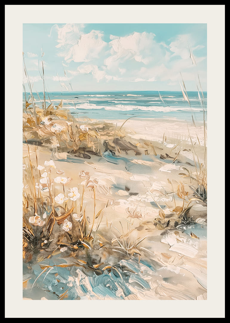Bring a sense of calm and harmony to your home with this beautiful poster of a sunny beach with soft sand dunes, wildflowers and a sparkling sea in the background. The soft brushstrokes and warm, natural colors create a dreamy atmosphere that brings to mind lazy summer days by the coast.