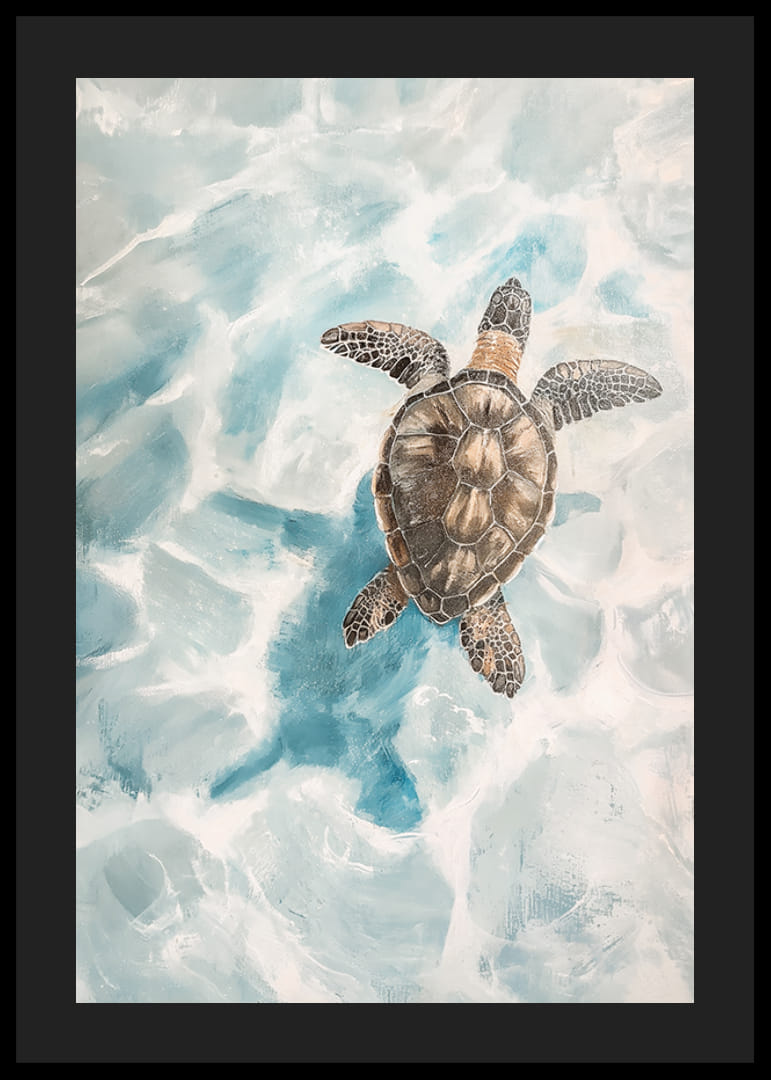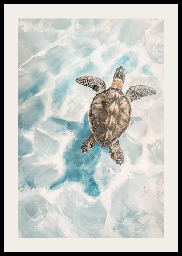 Bring the magic of the ocean into your home with this beautiful poster of a graceful sea turtle gliding through crystal clear water. The soft blue hues and detailed brushstrokes create a sense of calm, freedom and adventure beneath the surface.
