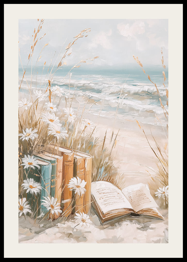 Create a dreamy and inspiring atmosphere with this beautiful poster of books resting in the sunny beach grass, surrounded by daisies with the ocean waves in the background. The soft color tones and artistic composition convey a sense of calm, imagination and relaxation.