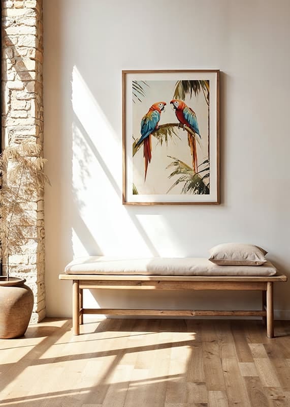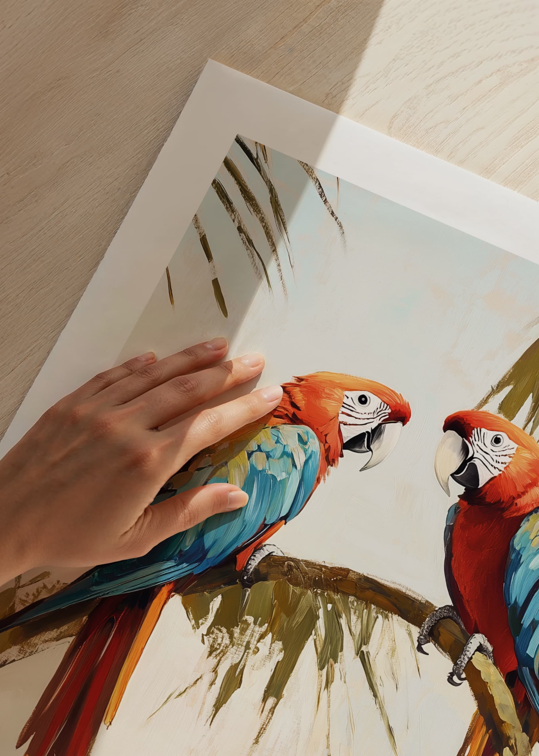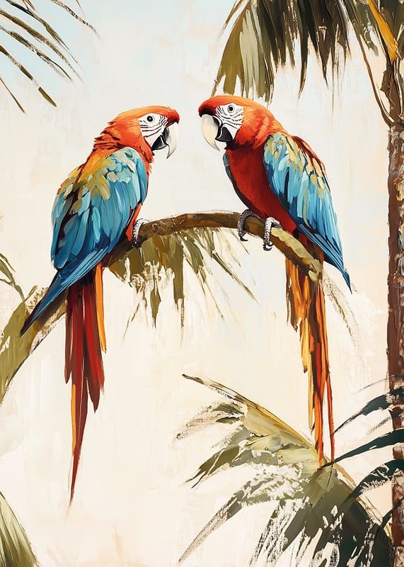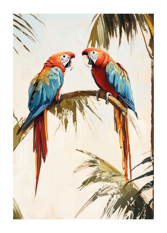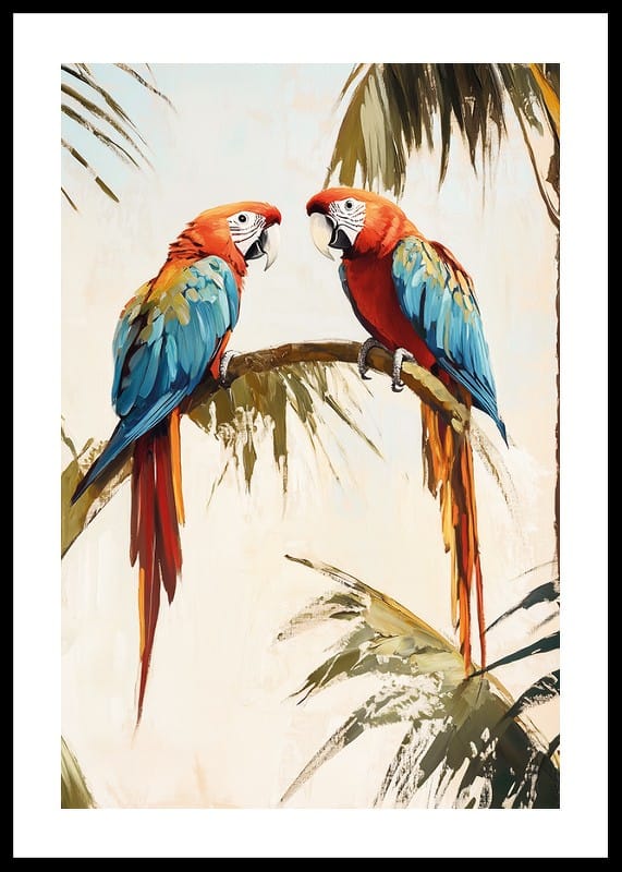 Create an exotic and colorful atmosphere with this beautiful poster of two colorful parrots resting on a palm branch. The vibrant red, blue and yellow tones add energy and life to any room, while the soft background creates a harmonious balance.