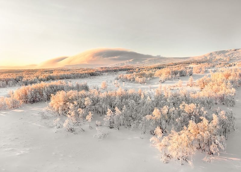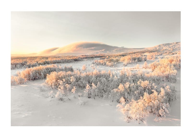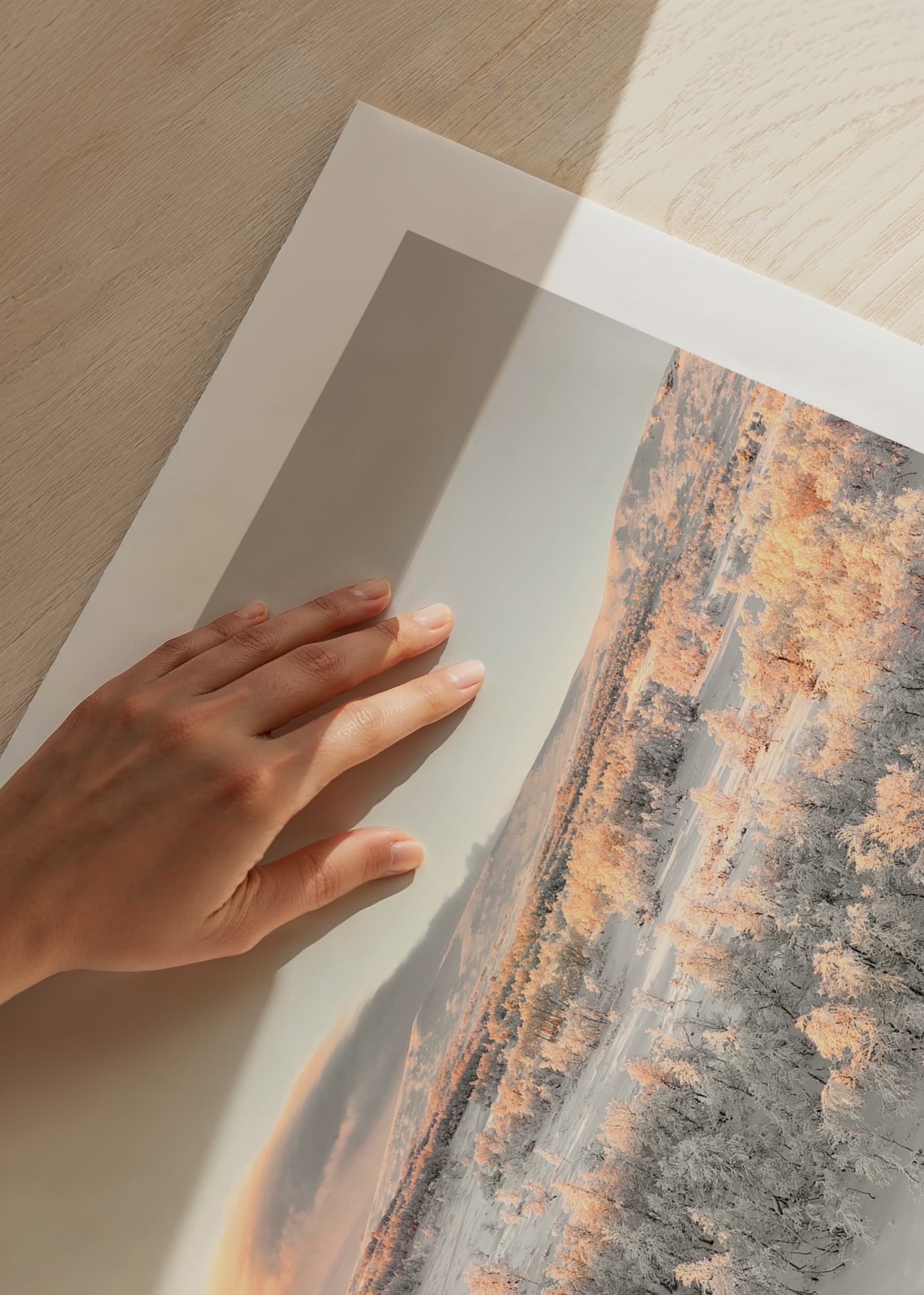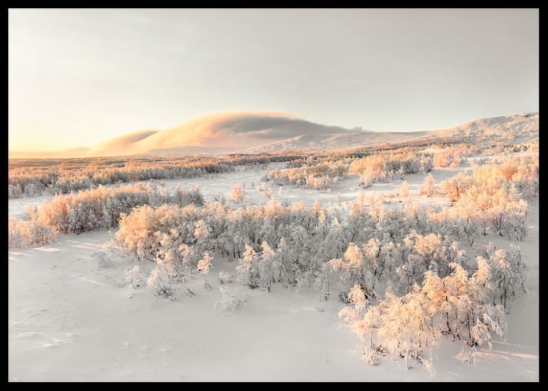 Experience the magic of winter with this magnificent poster that captures a snowy landscape bathed in soft, golden morning light. The frost-covered trees and the open landscape give a feeling of peace and tranquility, while the sun's warming rays create a beautiful contrast against the cold snow. Perfect for those who want to invite the stillness and beauty of nature into your home and let every day begin with a glimpse of the harmony of the winter morning.