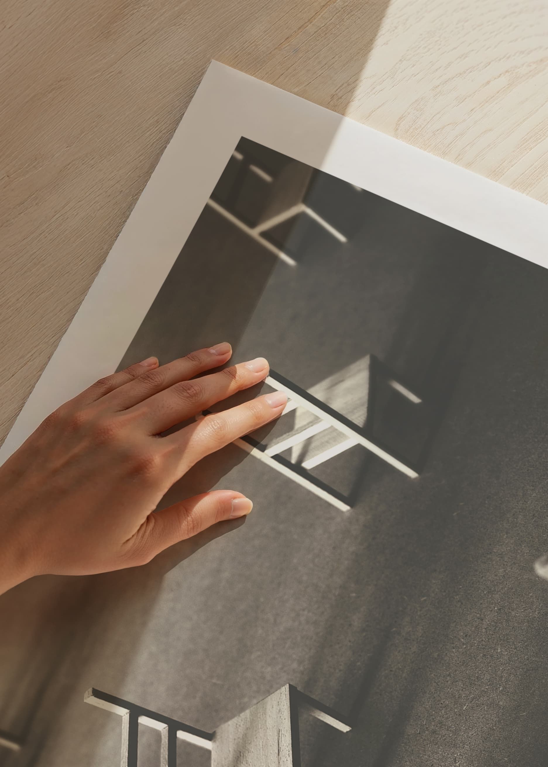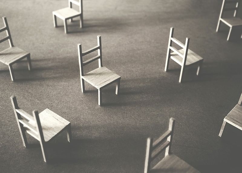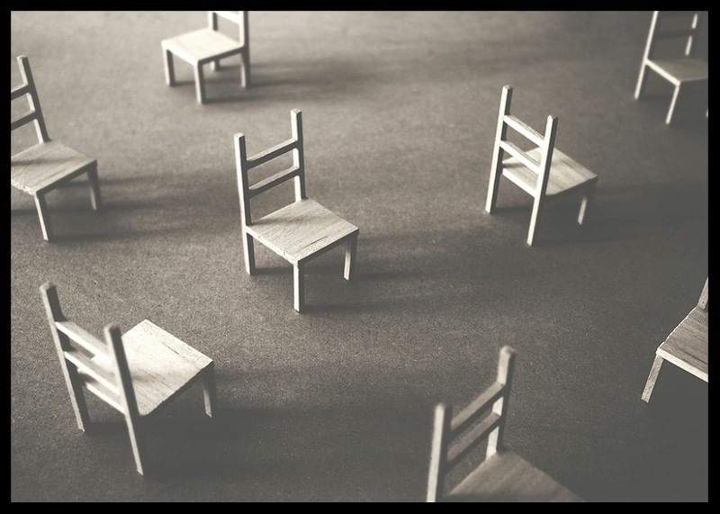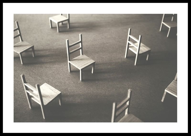 Create a sense of stillness and reflection with this artistic poster. The image shows a number of small chairs scattered on an empty floor, as a symbol of silence, solitude and space for reflection. Perfect for those looking for a subtle and thought-provoking interior detail that invites introspection and calm. A minimalist work of art that conveys the feeling of presence in absence.