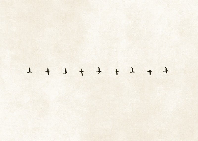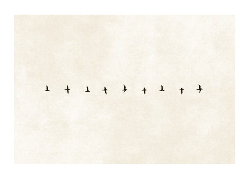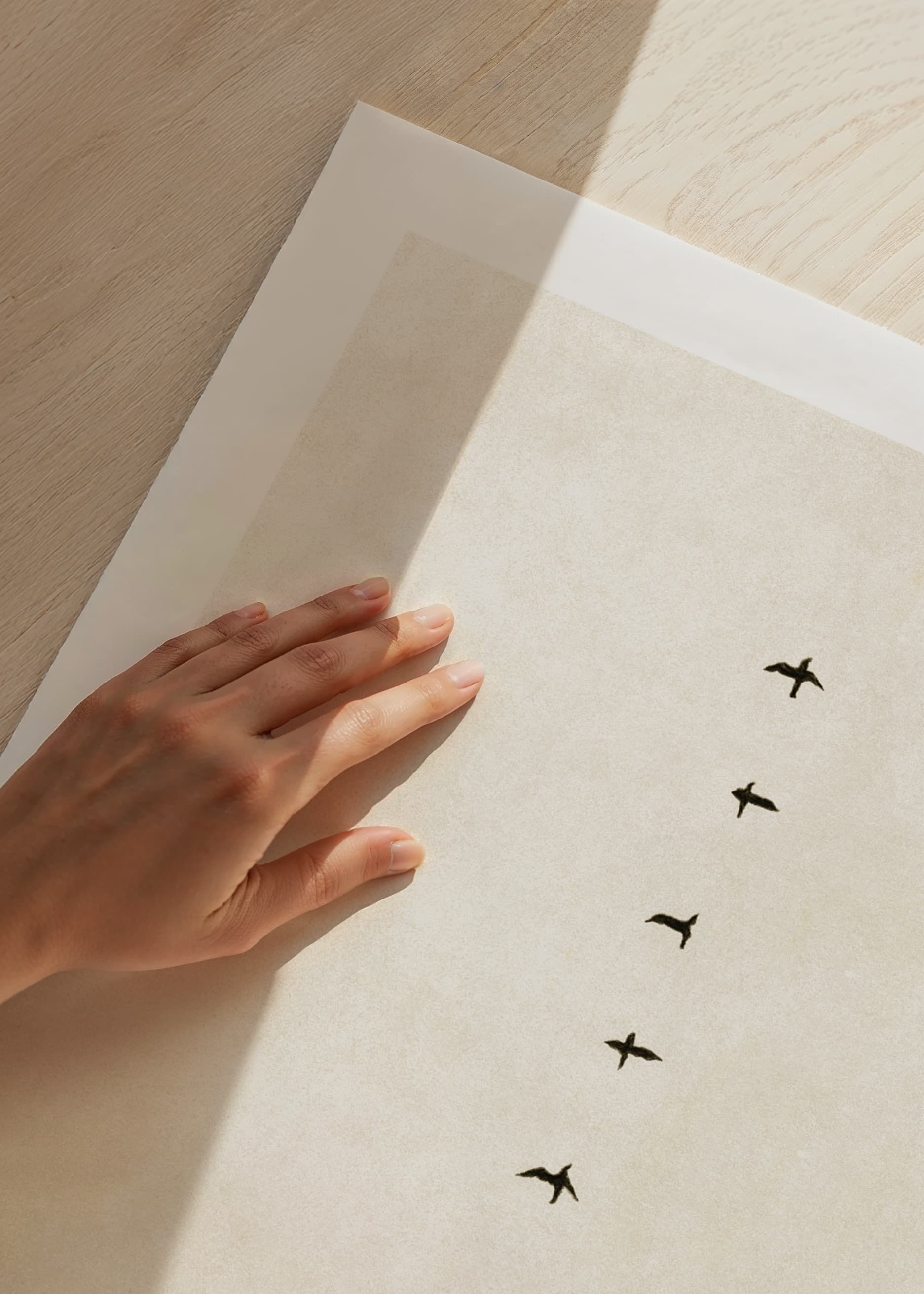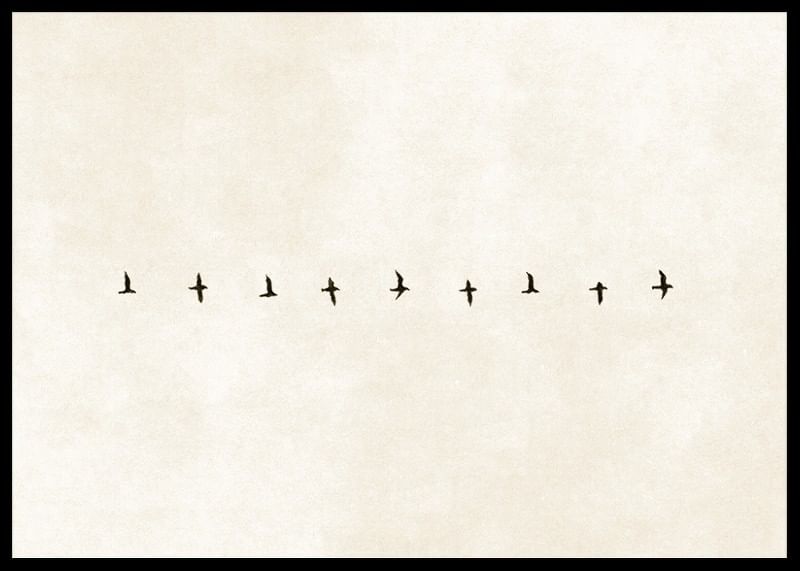 Create a sense of calm and freedom in your home with this minimalist poster. The image shows a simple formation of birds flying across the sky, a symbol of harmony and togetherness. The clean composition and soft tones give a calming effect that is perfect for any room where you want to create a relaxing atmosphere. A reminder of the beauty of nature and the journey of the free spirit.
