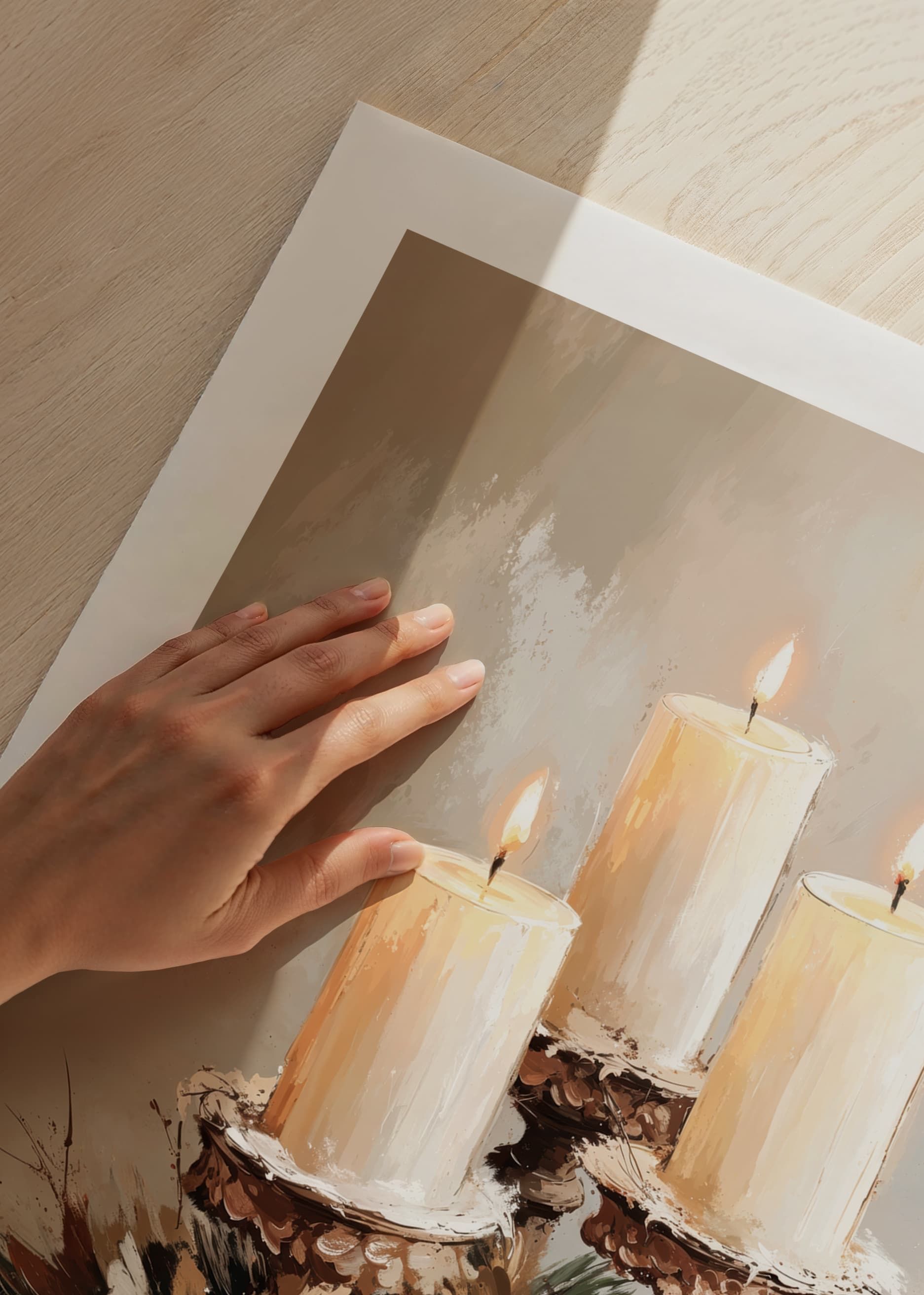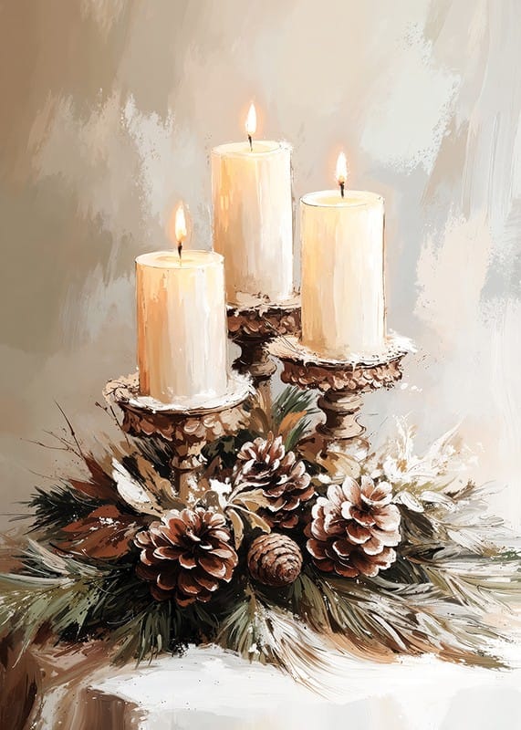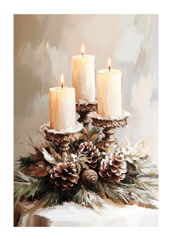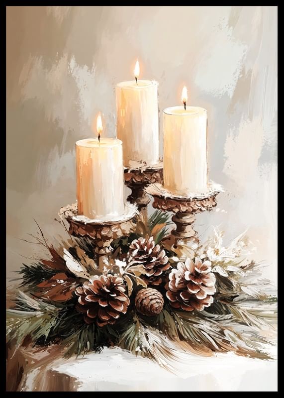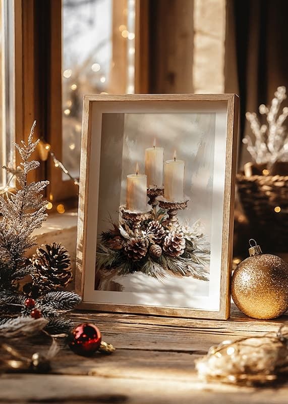 This poster spreads a warm and inviting Christmas atmosphere with three lit candles on elegant candlesticks, surrounded by frosty pine cones and evergreen twigs. The soft glow of the candles creates a calm atmosphere that is perfect for bringing harmony and cozy elegance to the home during the festive season. A beautiful reminder of the stillness of winter and the warmth of Christmas - a perfect decoration for any room at Christmas time.
