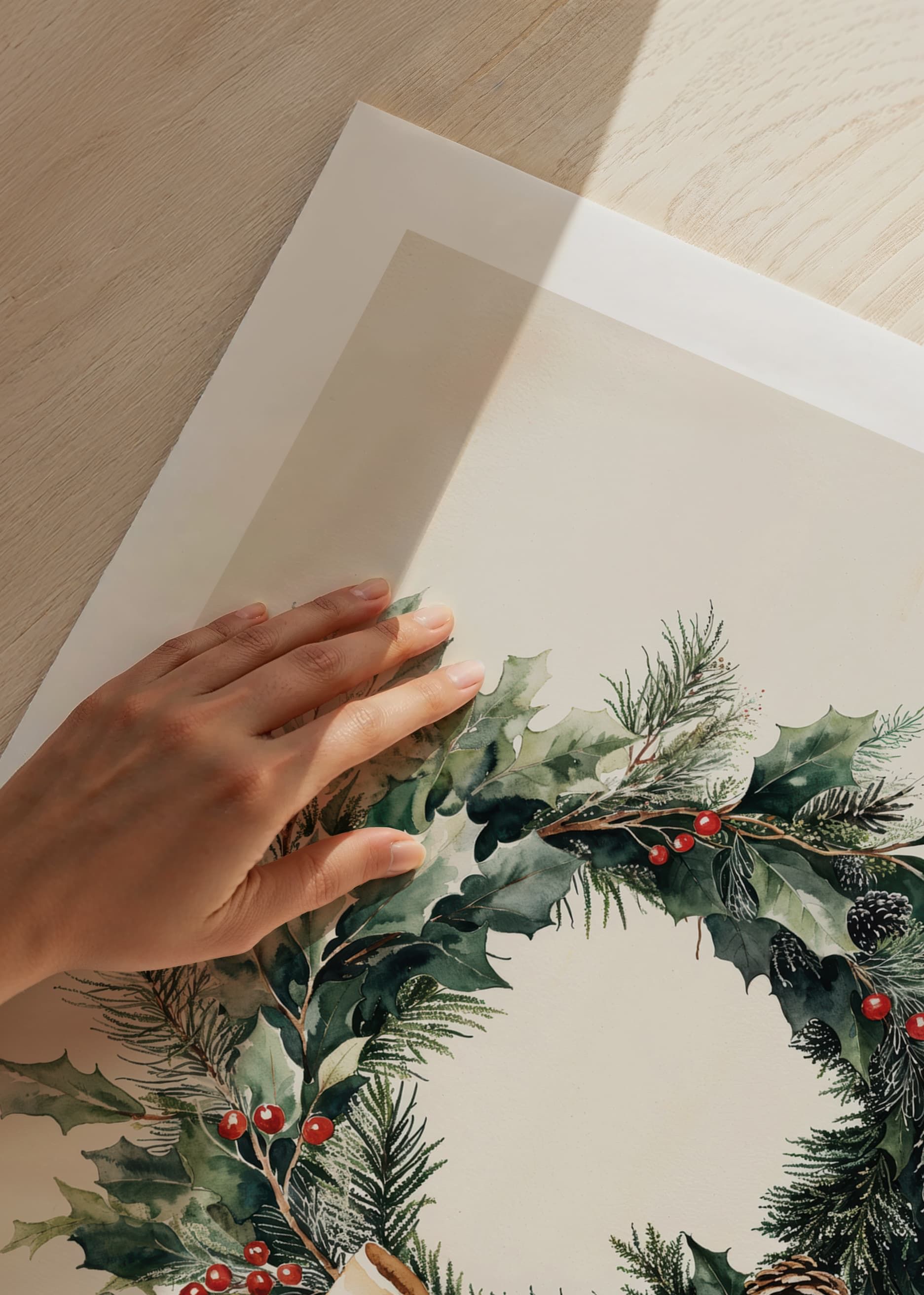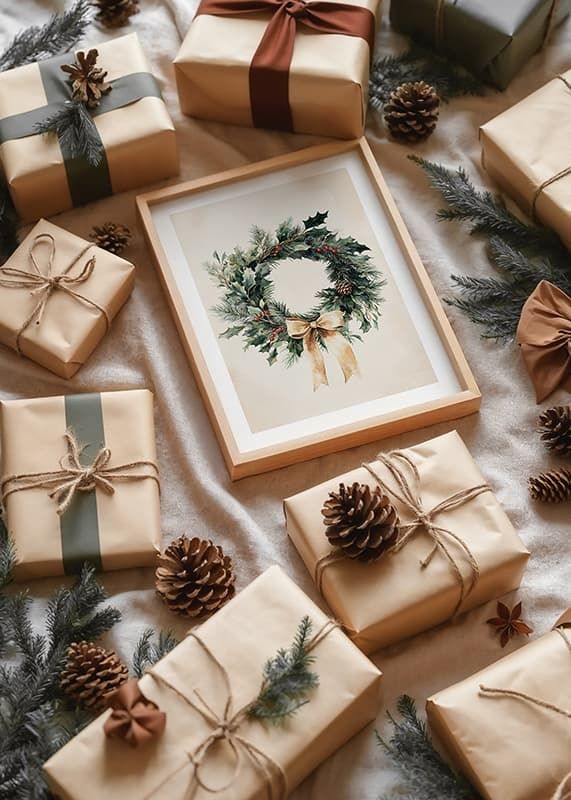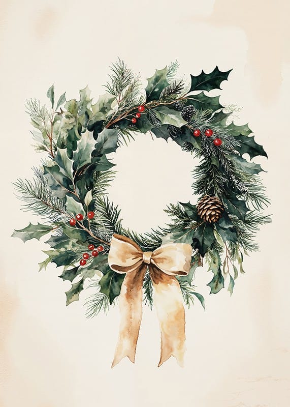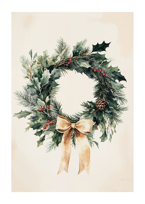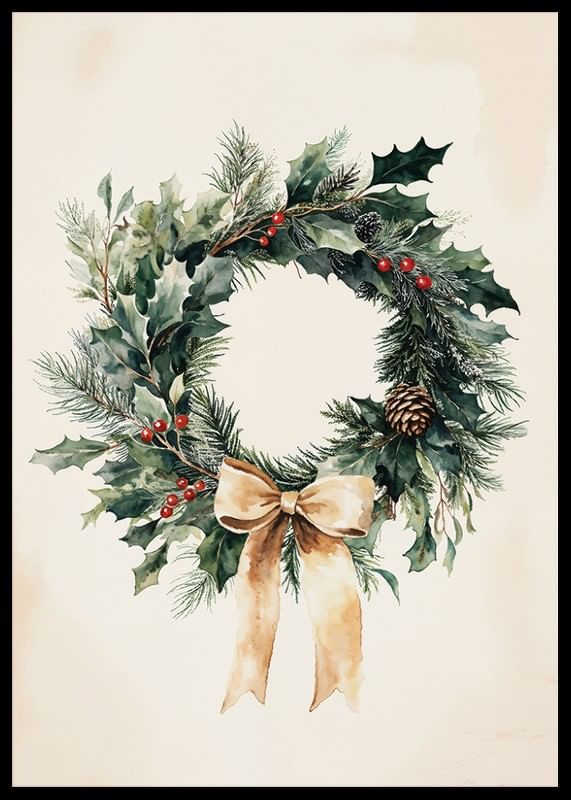 This poster captures the natural beauty of Christmas with a classic wreath of evergreen sprigs, red berries and an elegant bow. With its timeless design and harmonious colors, it spreads warmth and a festive atmosphere in the home. Perfect for creating an inviting atmosphere in the run-up to Christmas, this wreath post is both elegant and rustic - a reminder of nature's simple, yet beautiful details during wintertime.