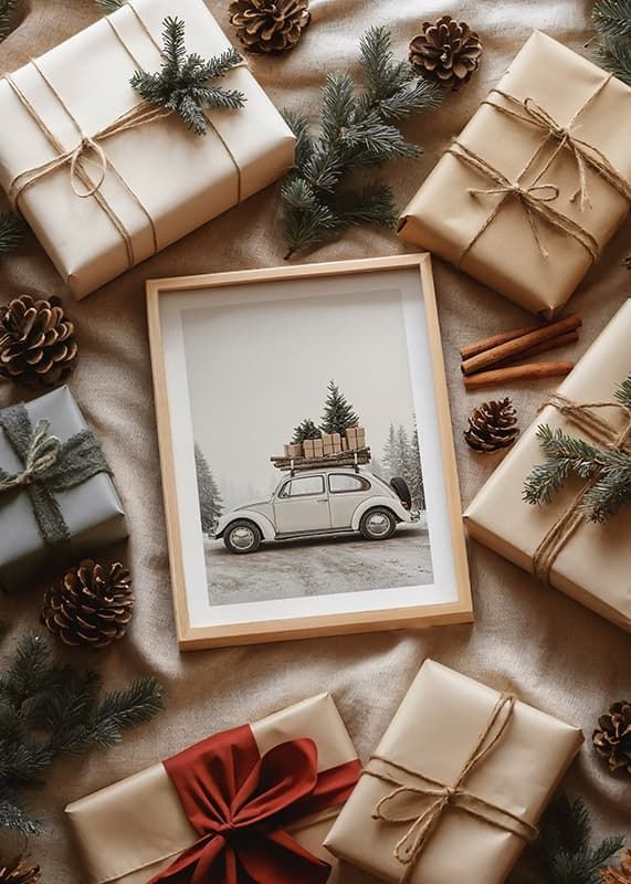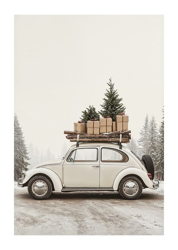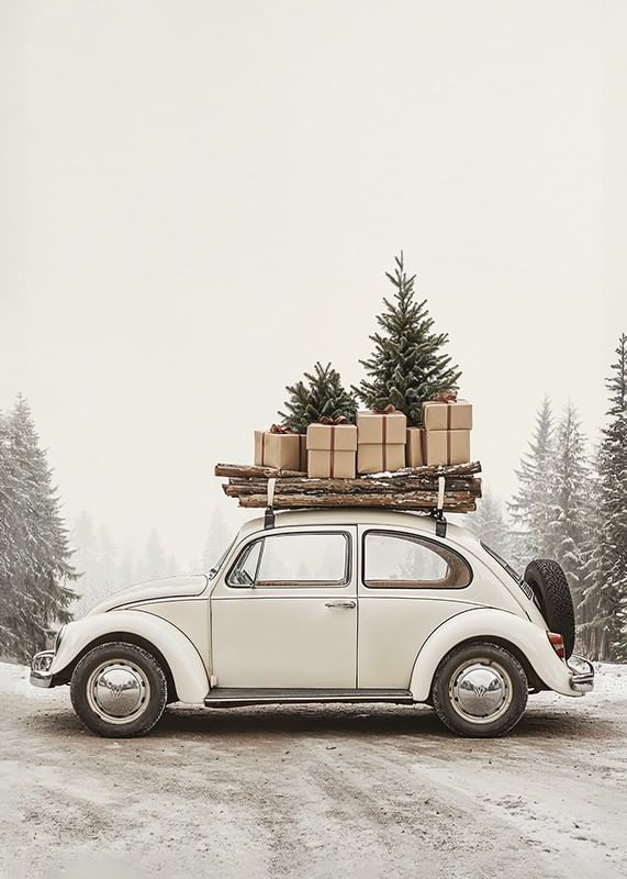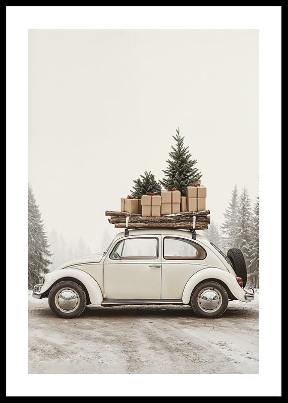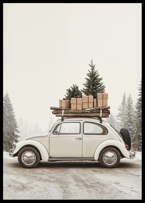 Here's a poster that captures winter magic and nostalgia! A classic white folk bubble is parked on a snow-covered forest road with a load of Christmas presents, firewood and a green Christmas tree on the roof. With a perfect balance of vintage feeling and winter romance, the image creates a sense of adventure and warmth. This poster is ideal for creating a cozy atmosphere in the home and recalling charming Christmas memories in a snowy landscape.