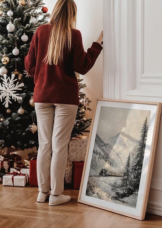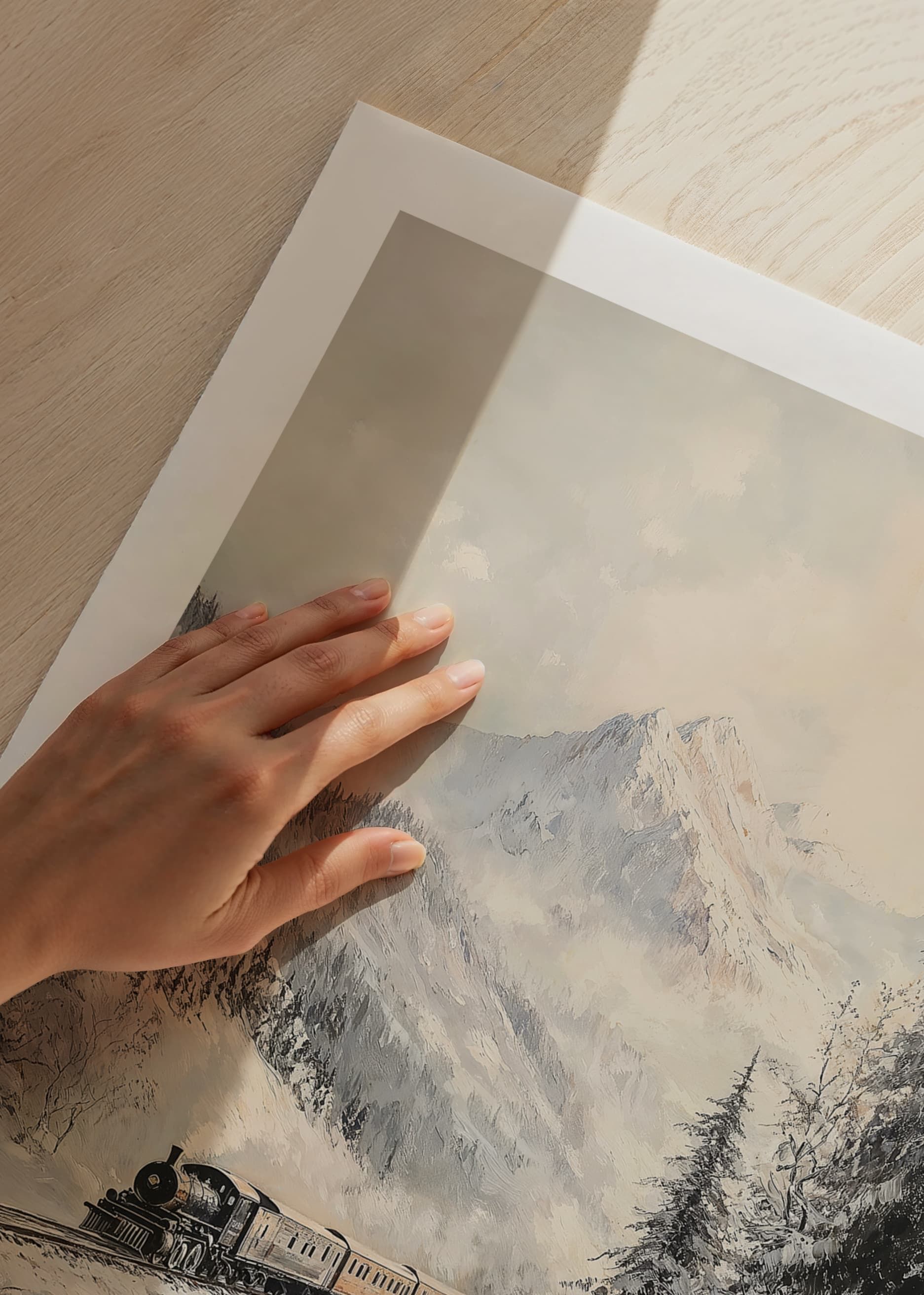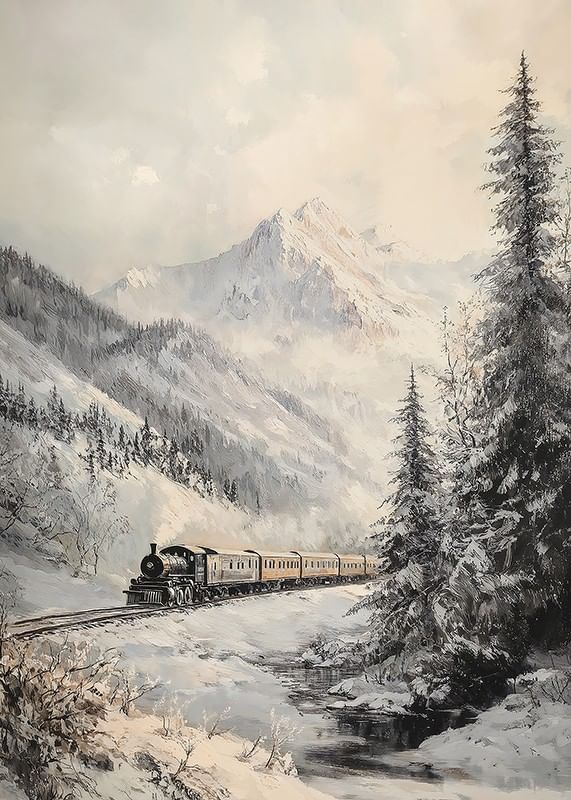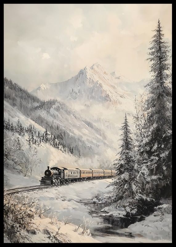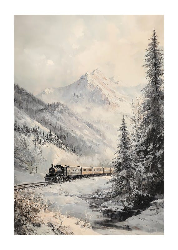 Bring in the grandeur of winter with this dreamy poster! The image shows a classic steam train winding its way through a snow-covered valley, surrounded by majestic mountains and frosty trees. The warm color of the train contrasts beautifully with the white landscape and creates a sense of adventure and nostalgia. Perfect for conveying the charm of winter travel and the quiet beauty of nature in your home.