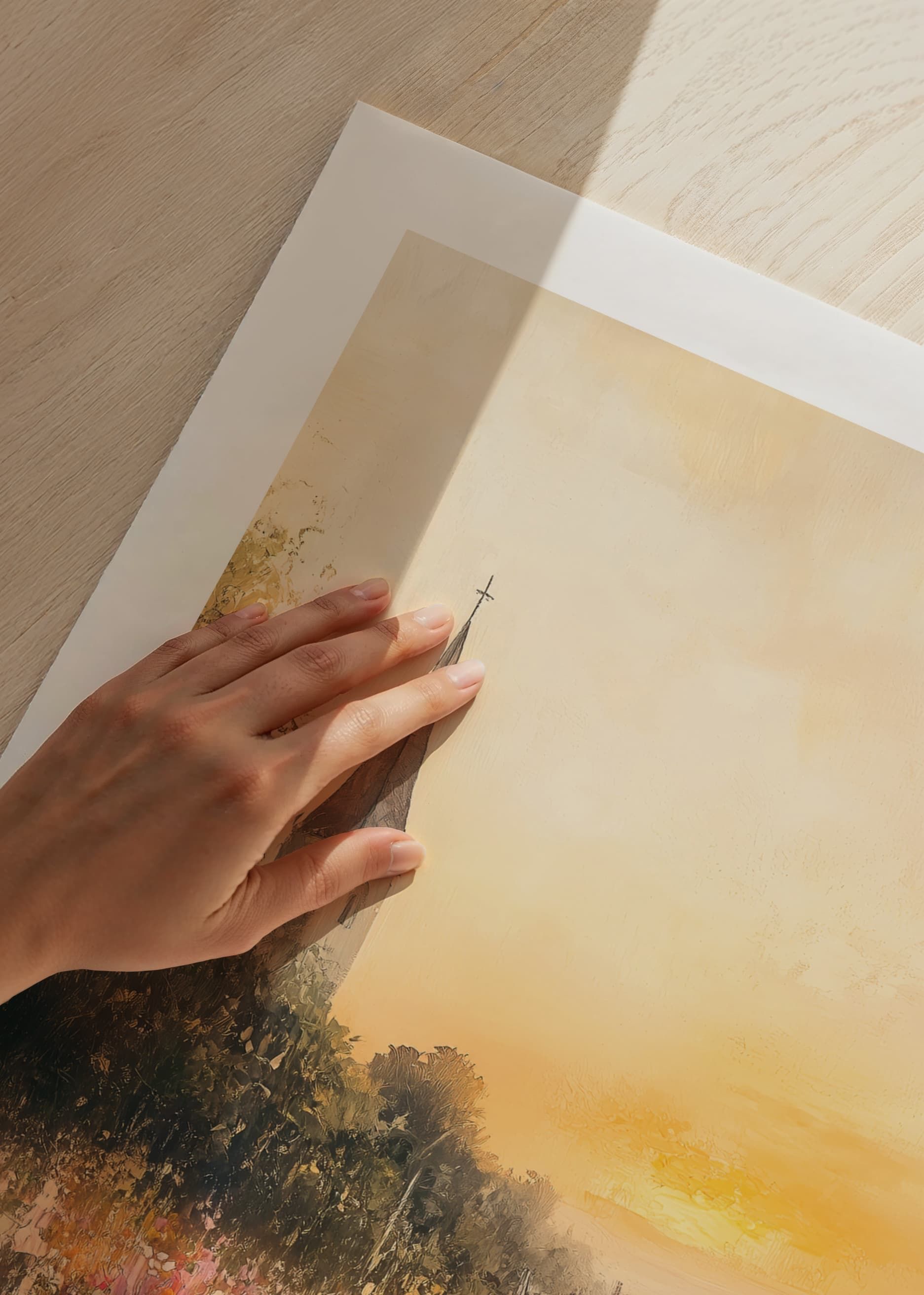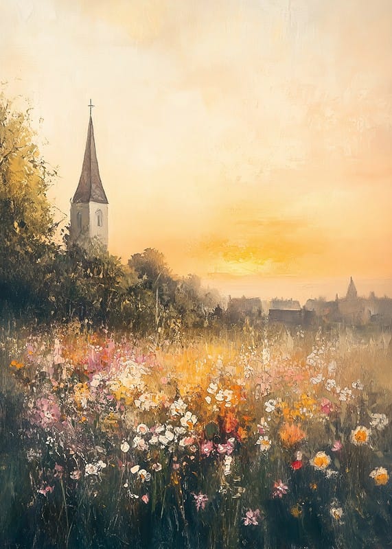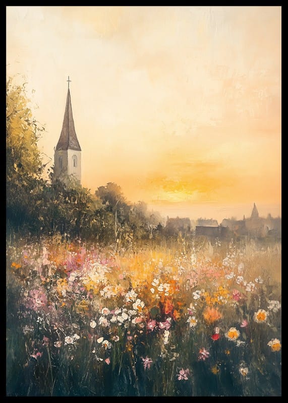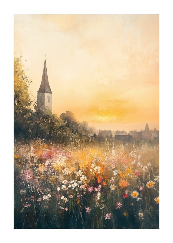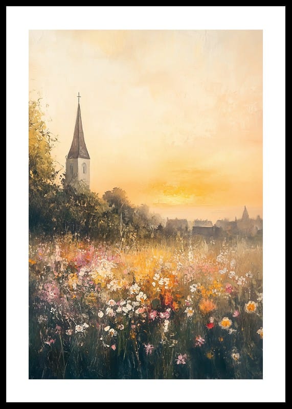 This poster captures the serene beauty of a sunset over a blooming meadow, where a charming church rises against a golden sky. With its warm colors and harmonious landscape, the artwork conveys a sense of calm and timelessness. Perfect for creating a calming atmosphere in your home, this motif celebrates the simple beauty of nature and village life