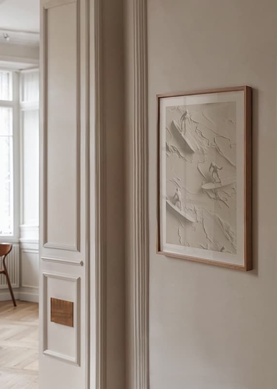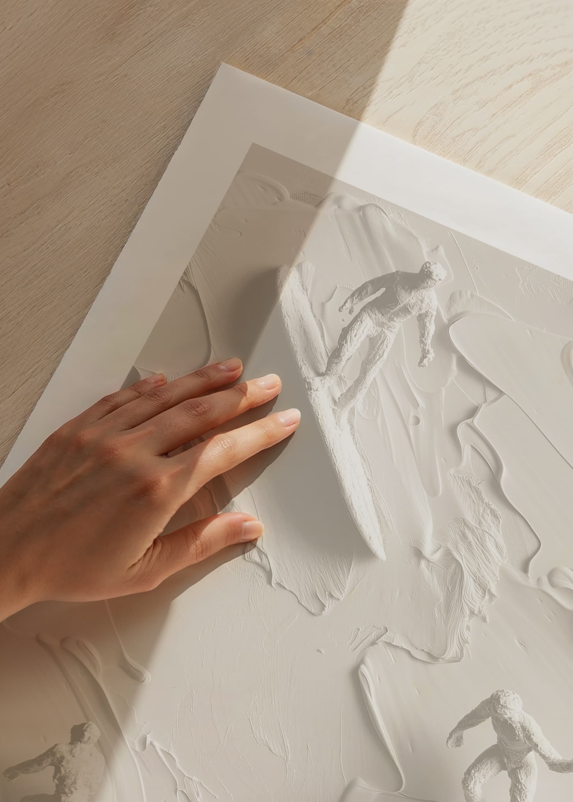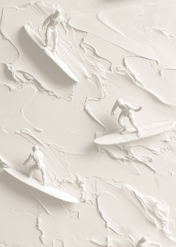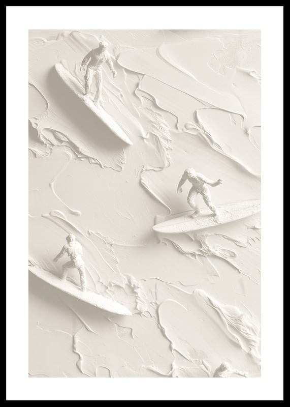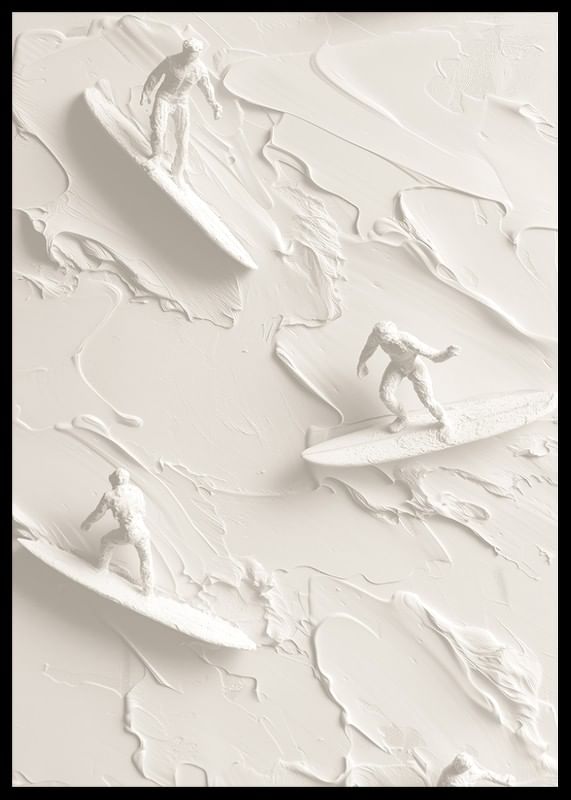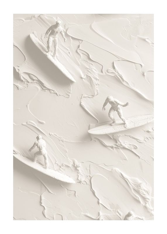 A unique poster that captures the energy and movement of surf culture through textured figures riding abstract waves in a soft, monochrome palette. The detailed shapes create a sense of freedom and adventure, perfect for giving your home a modern and vibrant atmosphere.
