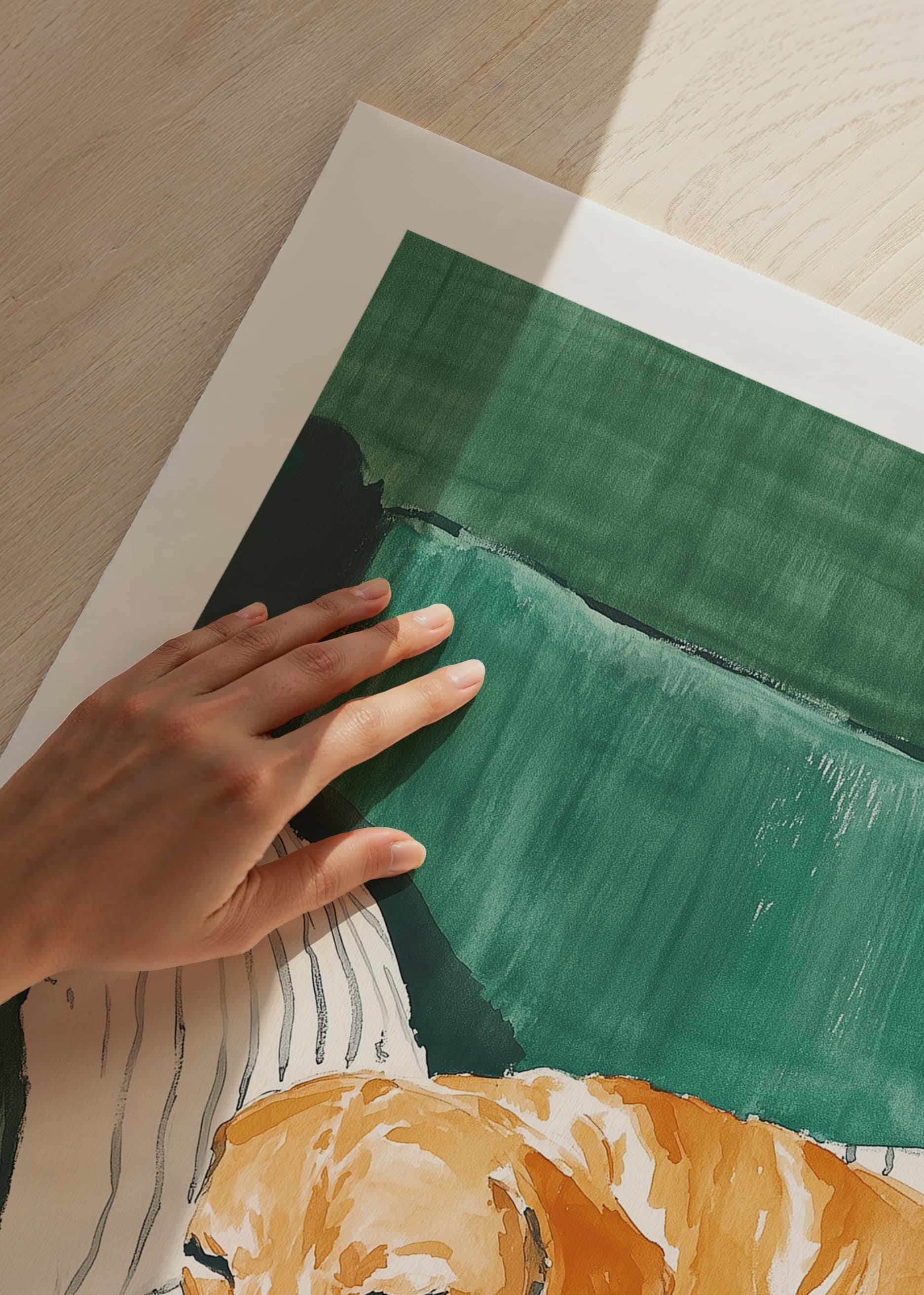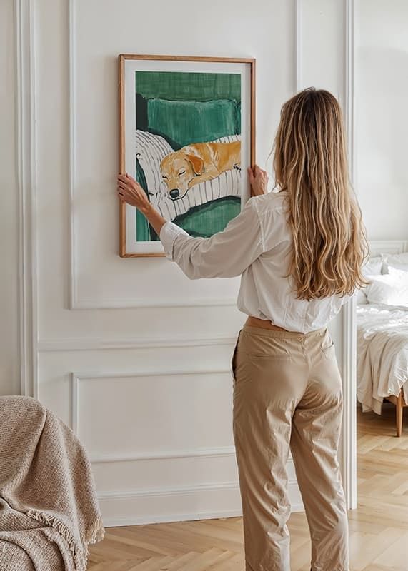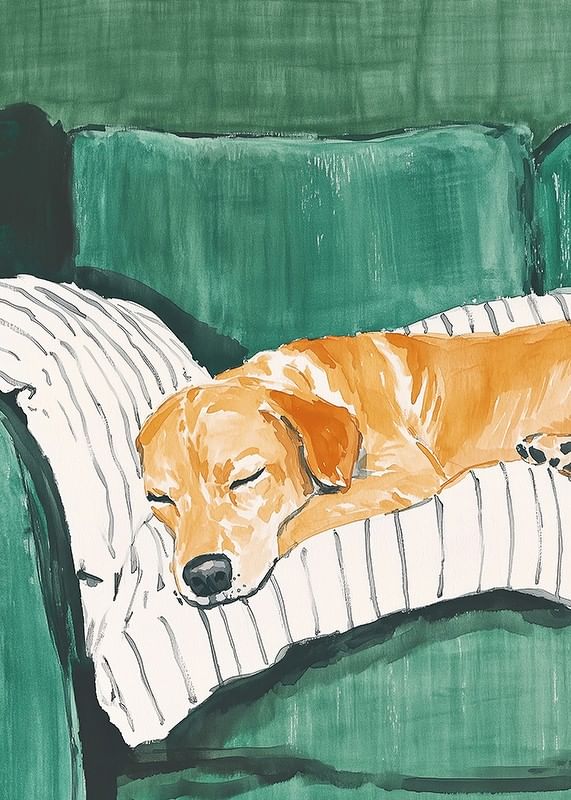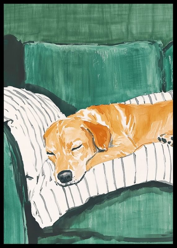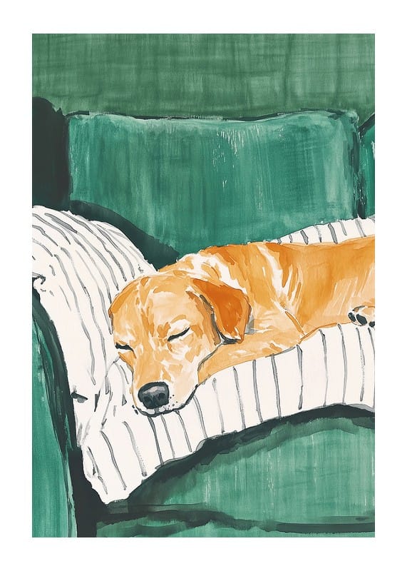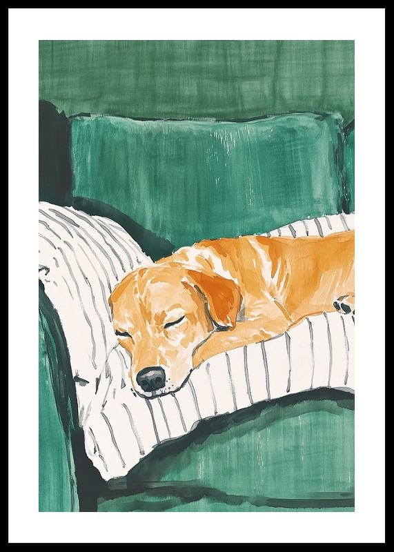 This charming poster shows a sleeping dog resting comfortably on a striped cushion on a green sofa. The soft colours and peaceful atmosphere create a warm and homely feel, perfect for giving your home a relaxed atmosphere.