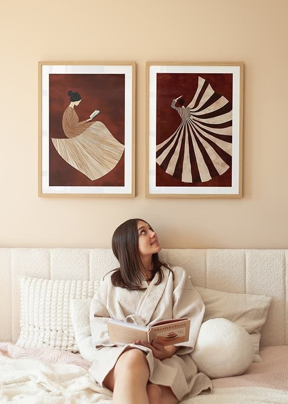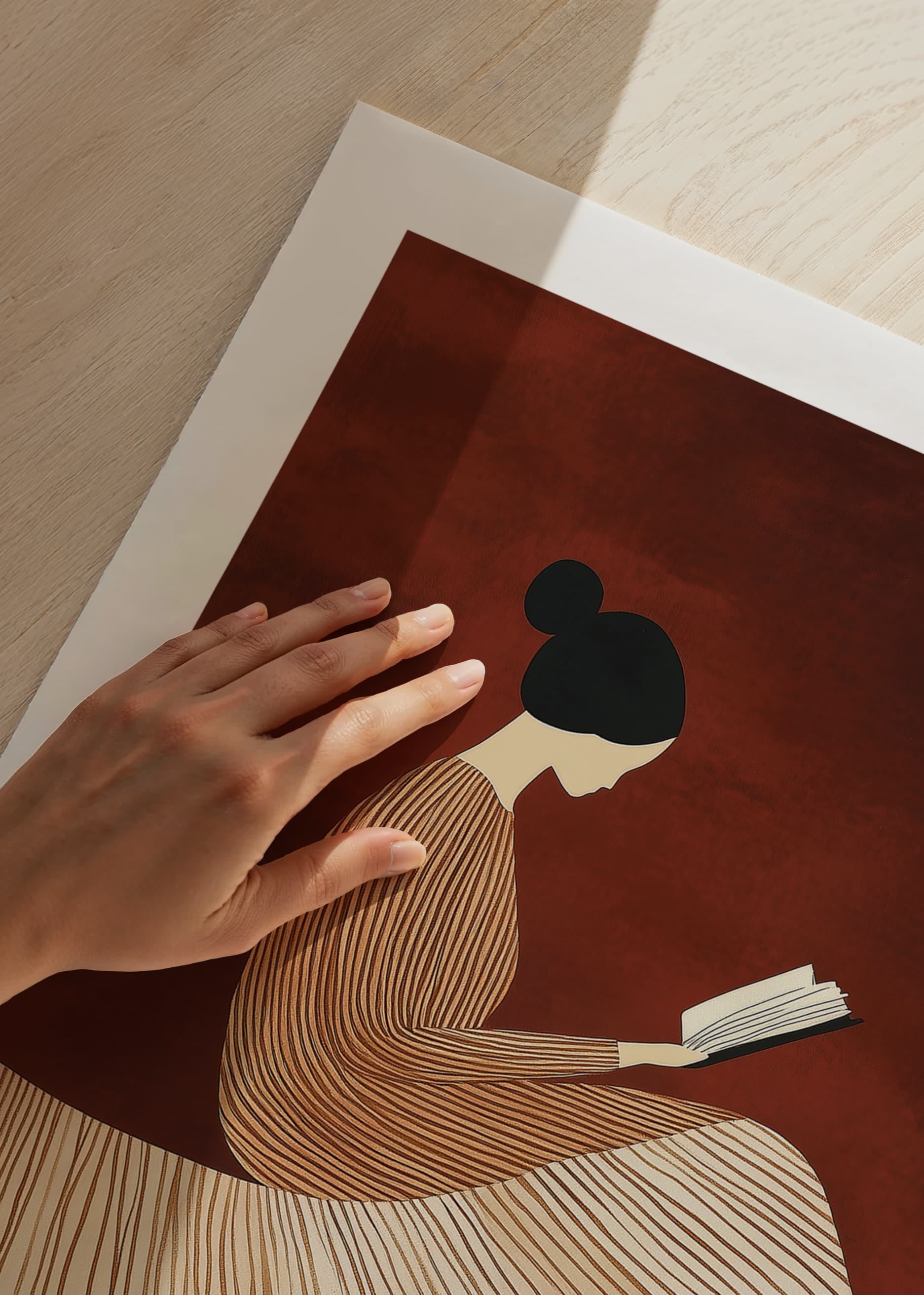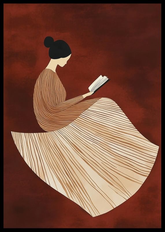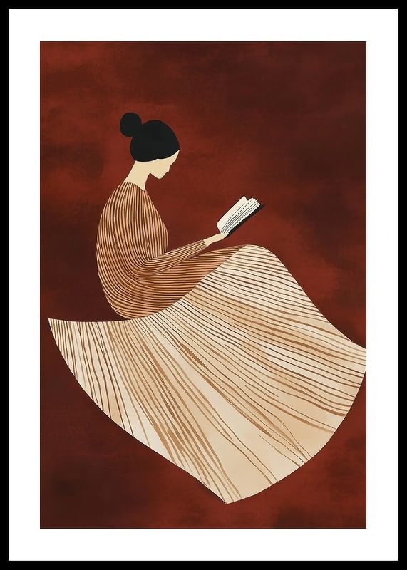 This beautiful poster depicts a stylized figure in an elegant, linear dress, deeply immersed in a book against a warm, reddish-brown background. The soft lines and harmonious colors create a sense of calm and contemplation.