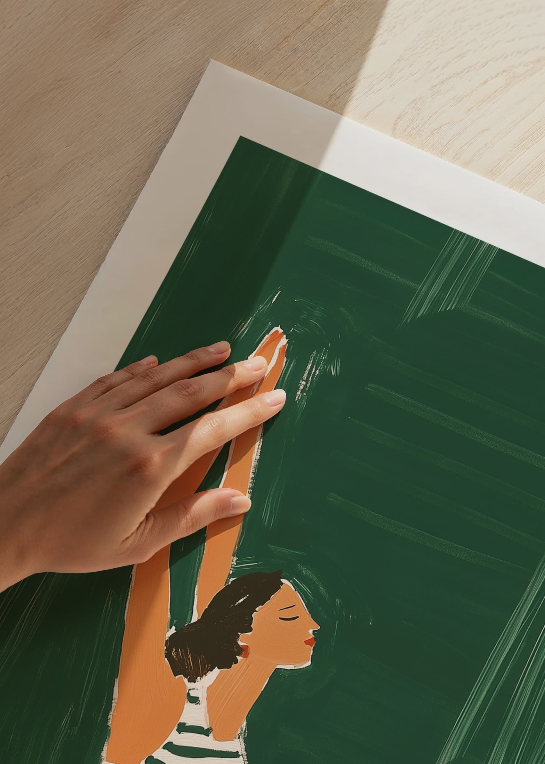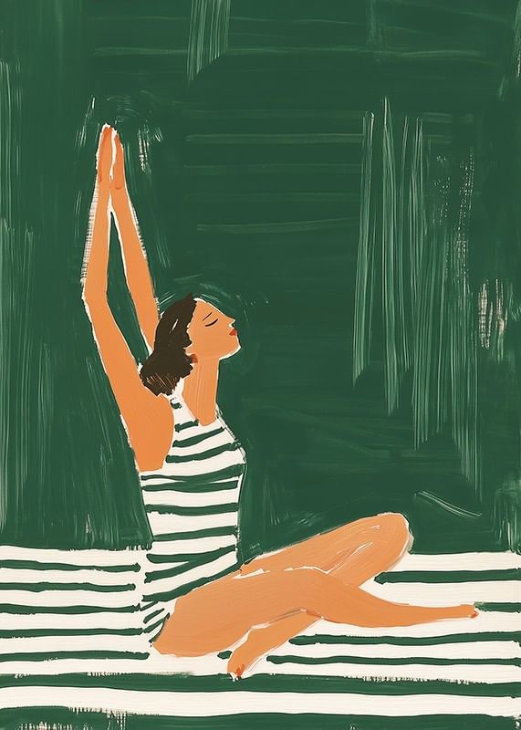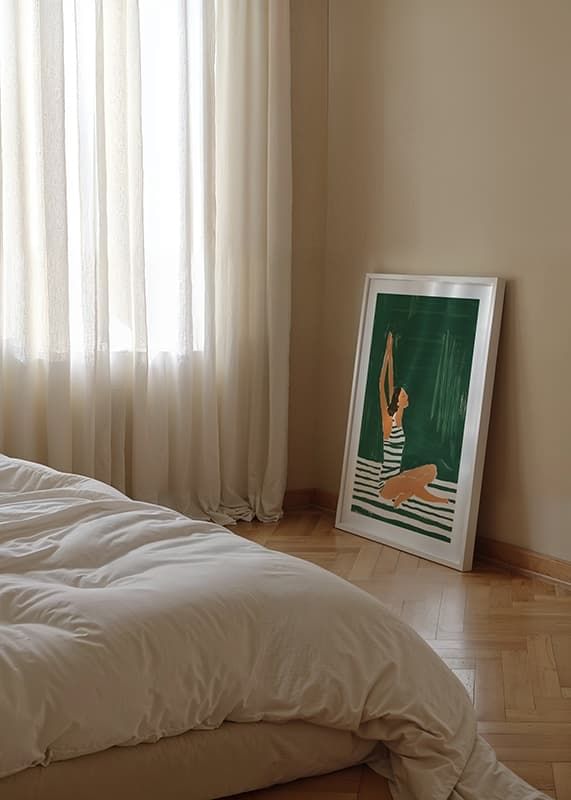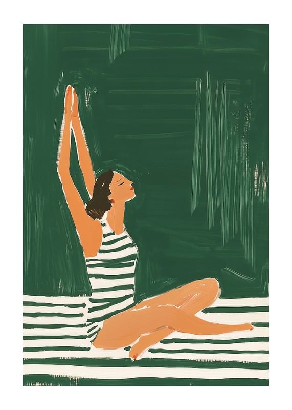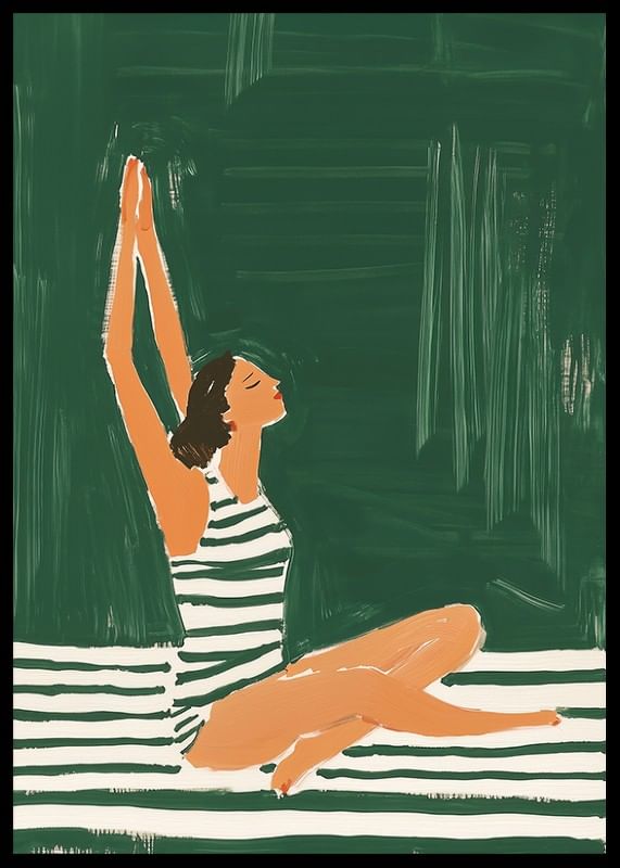 This harmonious poster depicts a woman in a striped swimsuit reaching towards the sky in a calm, relaxed pose. The green and white tones create a peaceful atmosphere, perfect for adding a sense of balance and tranquility to your home.