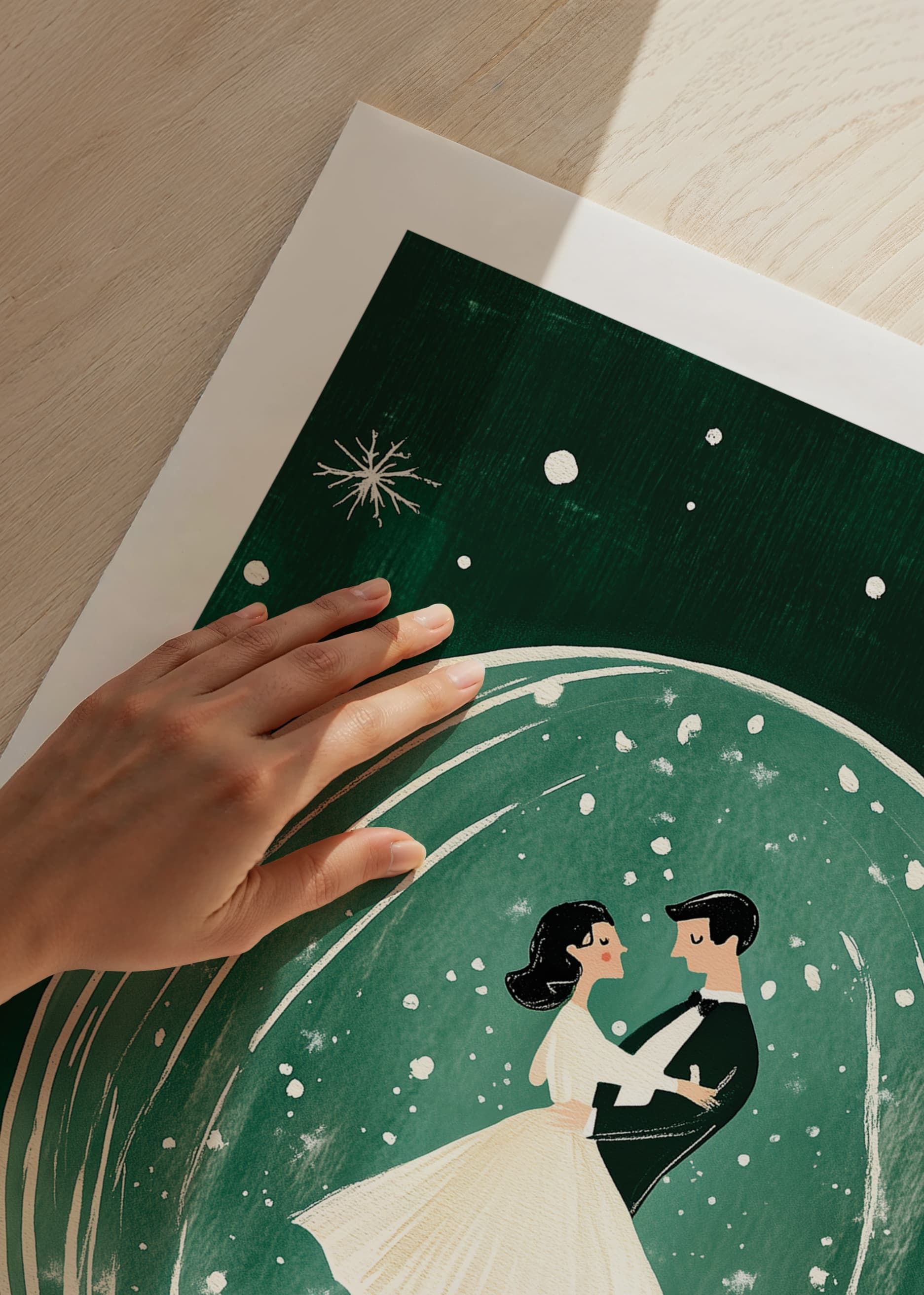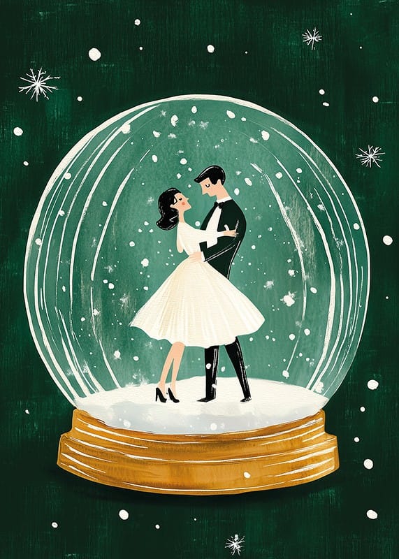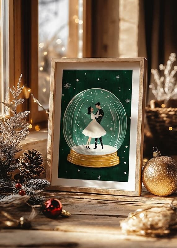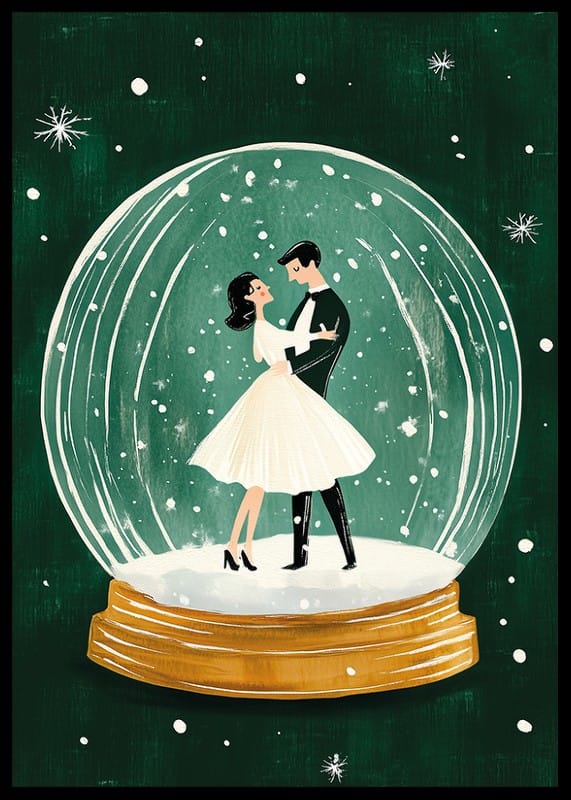 This romantic poster depicts an elegant couple dancing inside a sparkling snow globe, surrounded by falling snowflakes and a deep green background. The nostalgic and magical feel makes it perfect for creating a warm and festive atmosphere in your home during the winter months.
