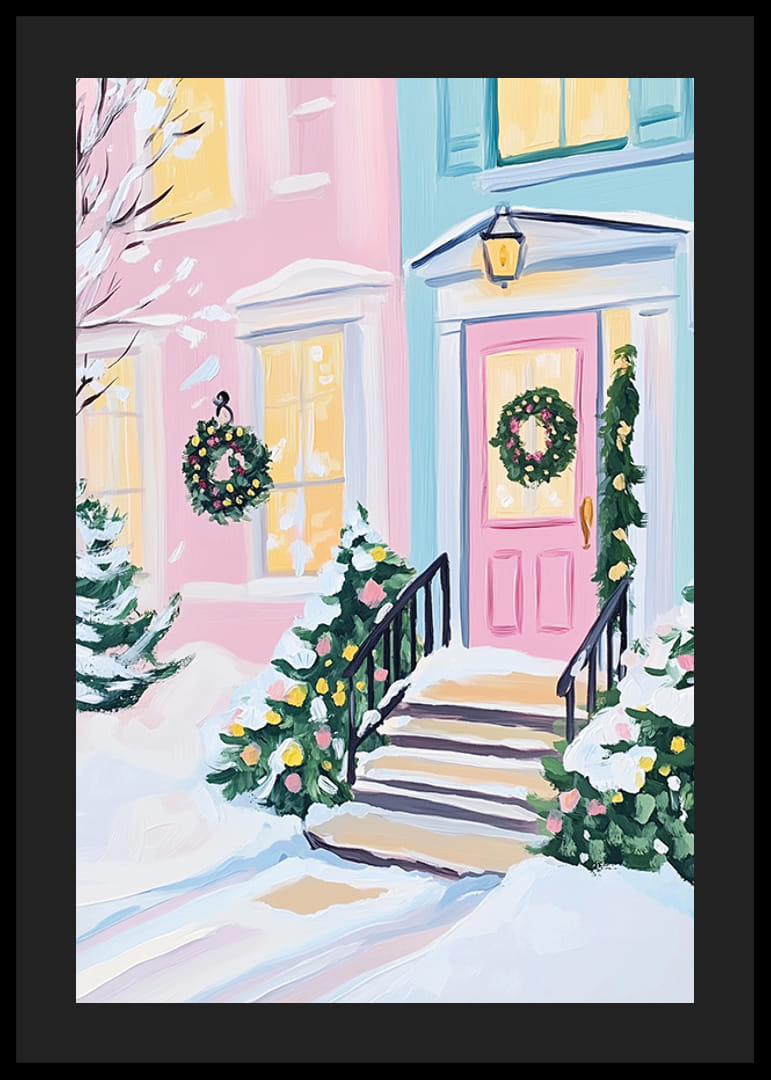 This inviting poster shows a beautifully decorated front door in pastel colors, surrounded by snow-covered bushes and Christmas wreaths. The warm lights shining through the windows create a homely and festive atmosphere.