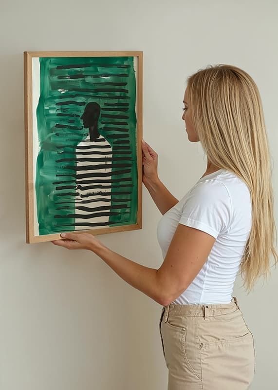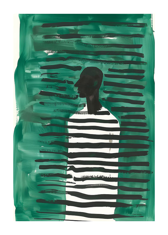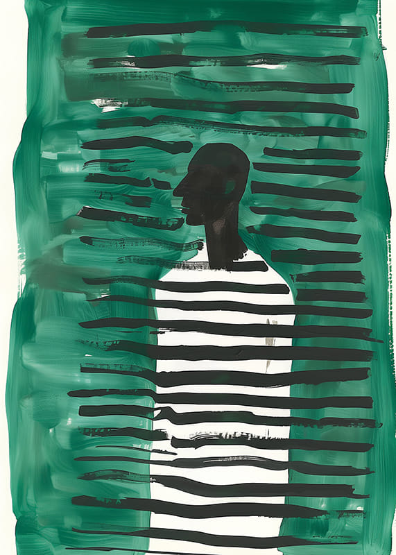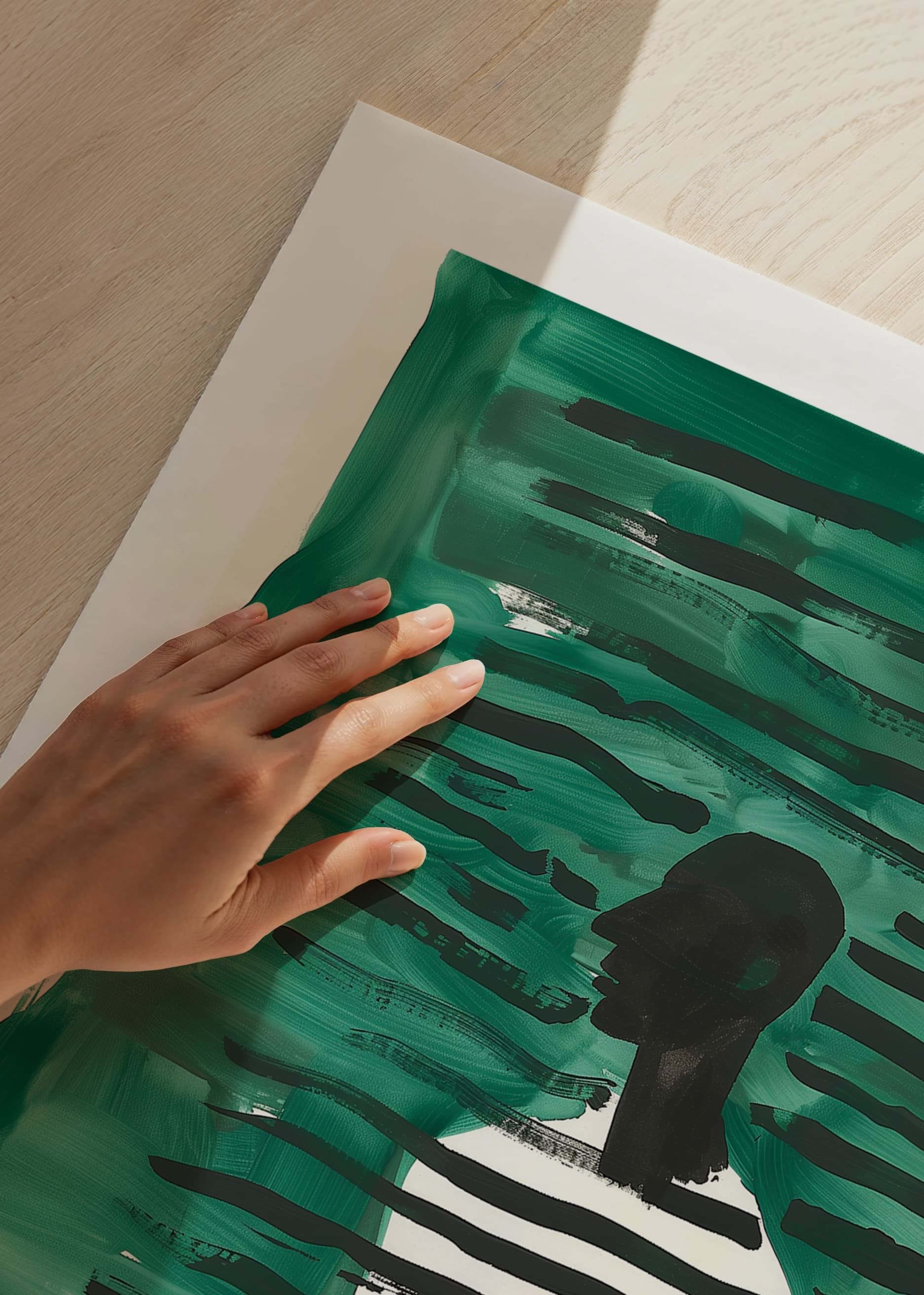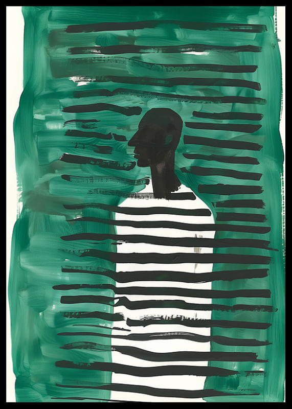 This abstract poster depicts a dark silhouette of a person wrapped in green and black horizontal lines, creating a sense of depth and contemplation. The contrasting colors and simple shapes give a modern and thought-provoking feel.