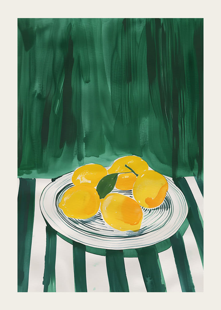 This fresh poster shows a collection of sunny yellow lemons arranged on a striped platter against a deep green background. The strong color contrasts and soft watercolor brushstrokes create a lively and summery feel.