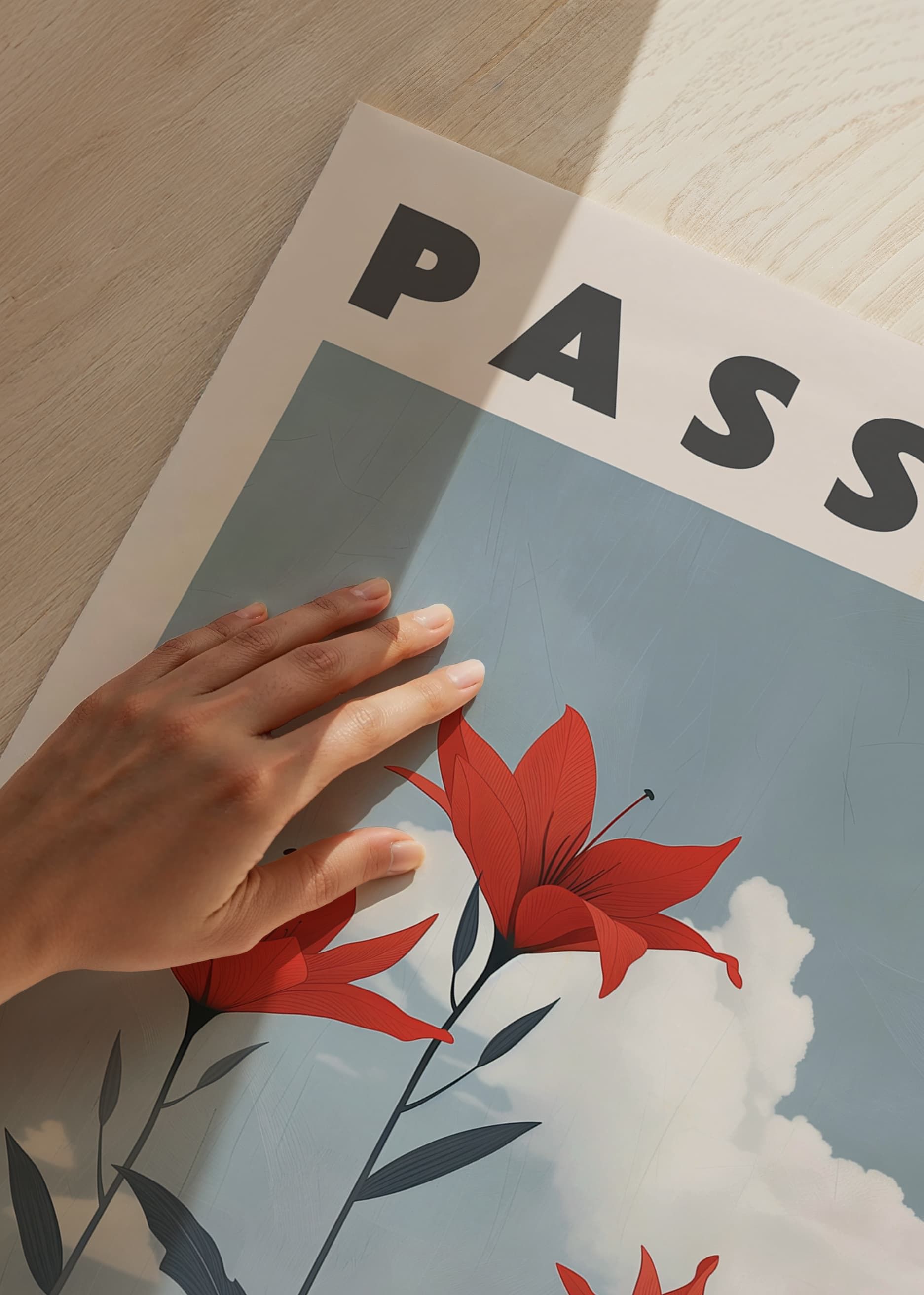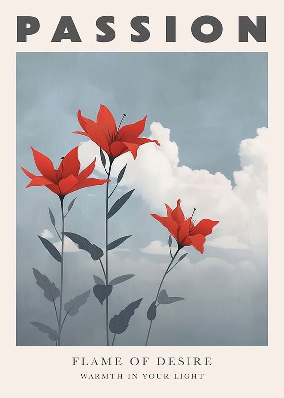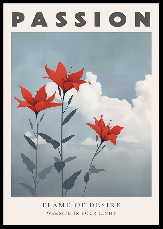 Fill your room with an explosion of emotion and style with this beautiful poster "Passion". The intense red lilies stand proudly against a stylish, soft blue sky, creating a delicious contrast that not only catches the eye, but also infuses the room with a warming energy.