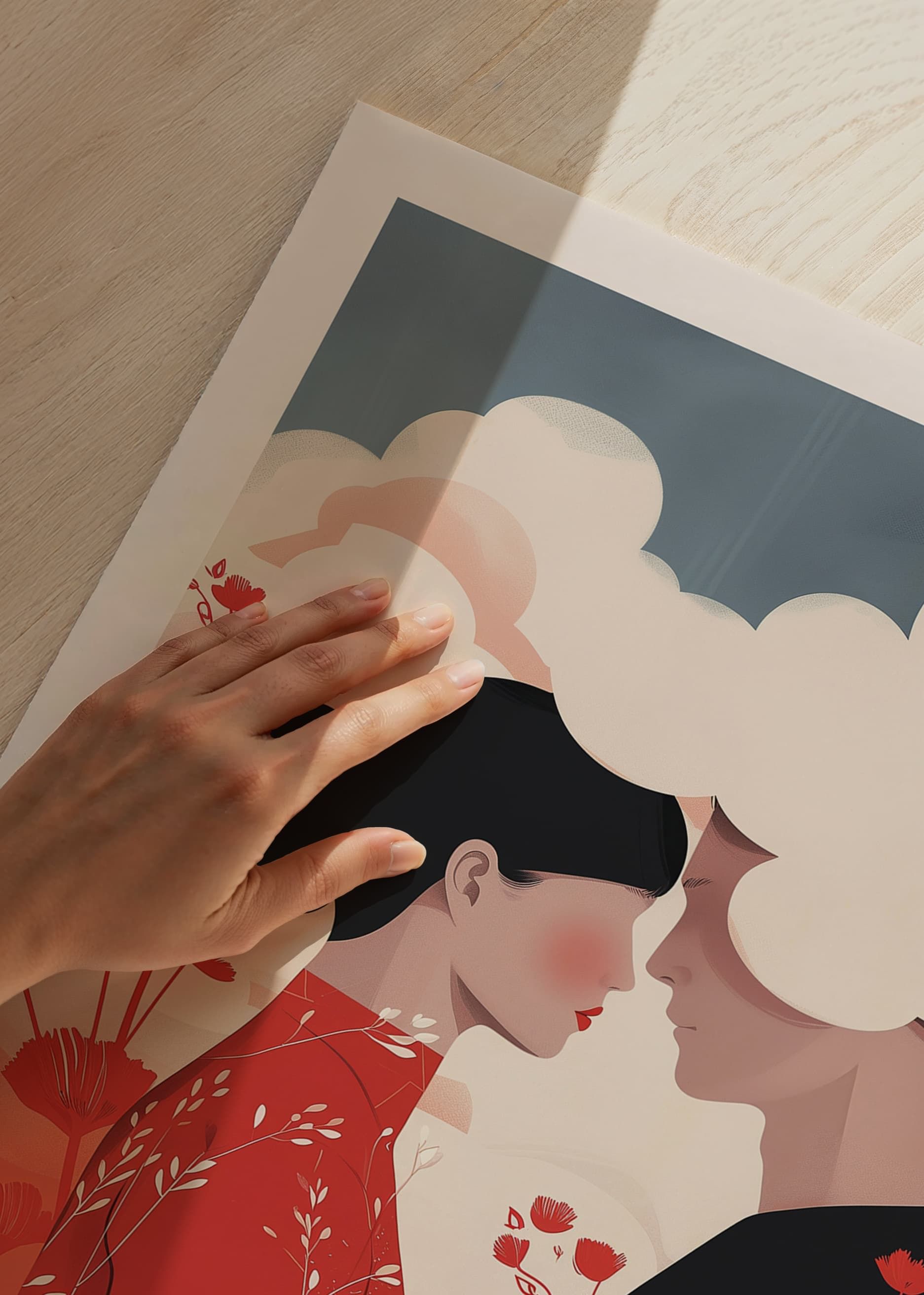 Experience the magical mix of love and closeness in this captivating poster. With its soft red and grey tones, it captures two souls in perfect harmony, surrounded by a sea of ​​flowers. This artwork speaks with whispers of comfort and deep connection.