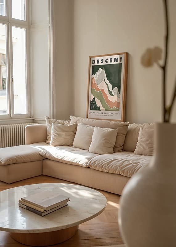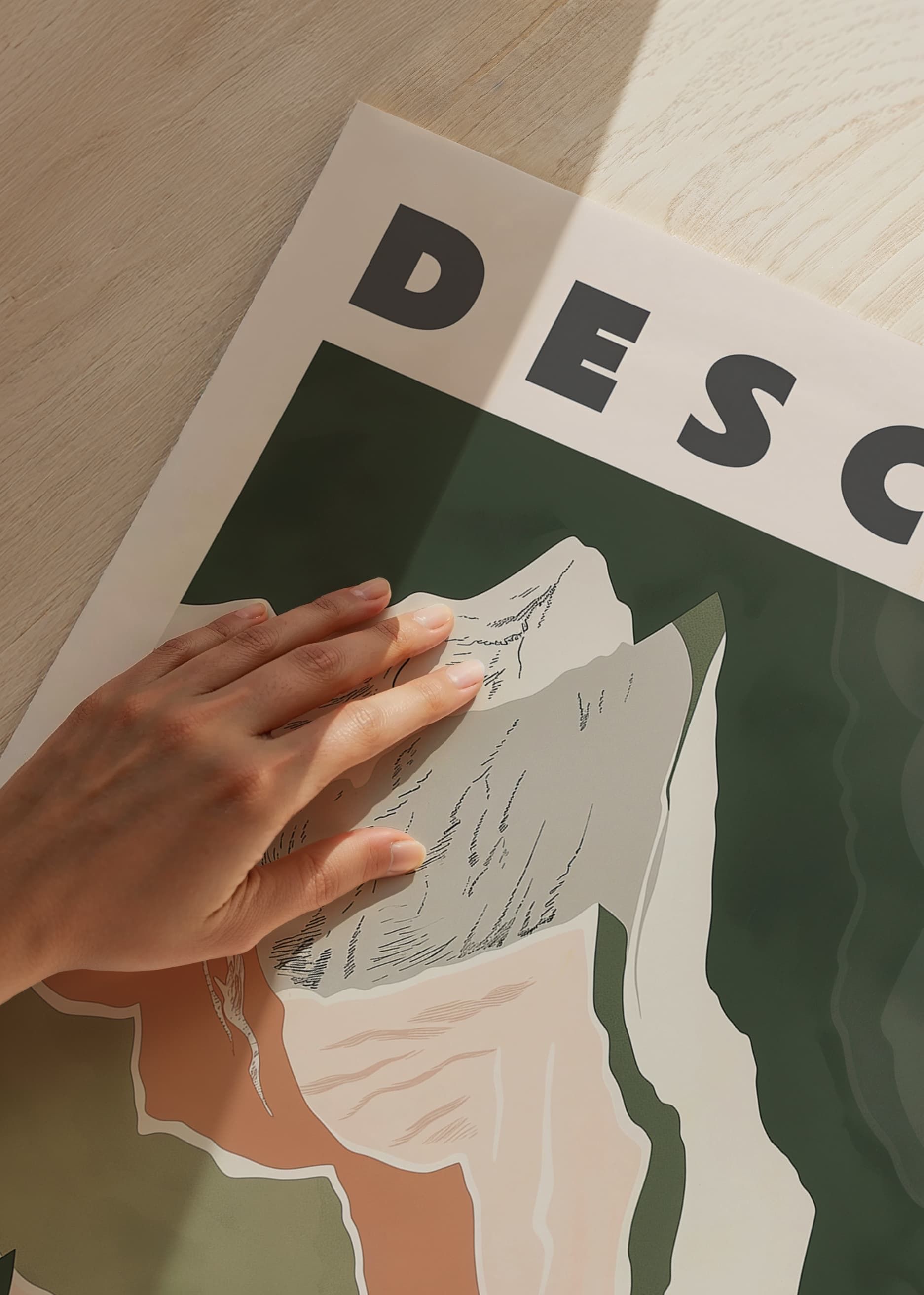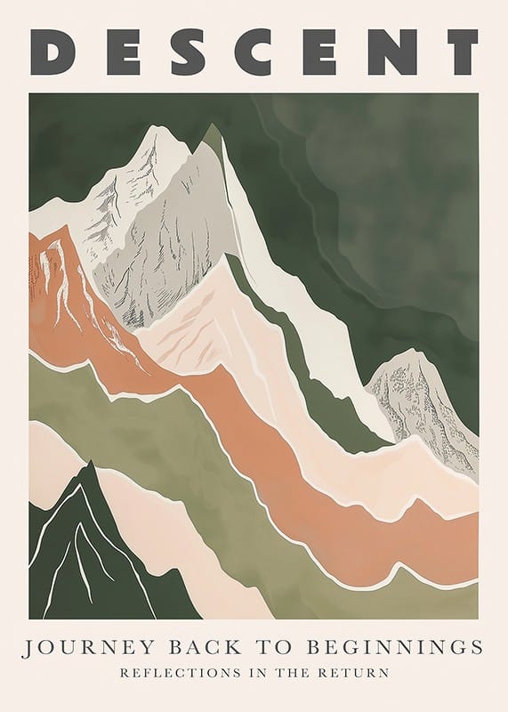 Immerse yourself in the beauty of nature with this fascinating poster "Descent". The harmonious color palette of green and orange hues leads the eye across stylized mountain landscapes, where every curve tells the story of a thought-provoking journey back to the roots.