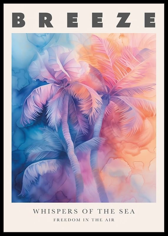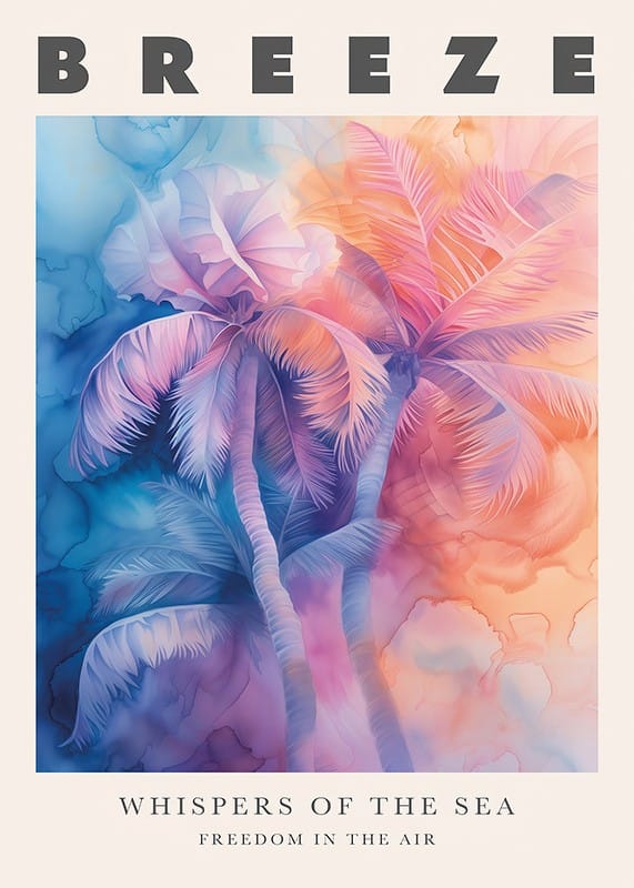 Discover the beauty of this dreamy ocean breeze poster, where soft pastels transform the palm trees into an elegant symphony of pink and blue tones. Let yourself be swept away by this visual poetry that carries with it the promise of freedom and the refreshing sound of the ocean's whispering waves.