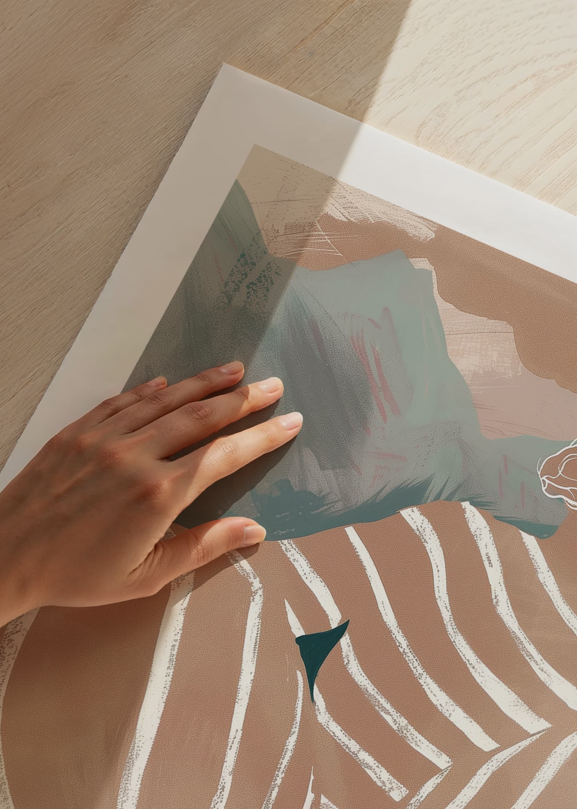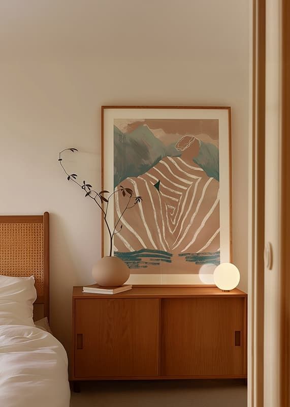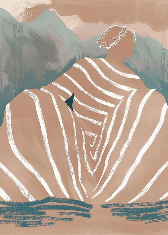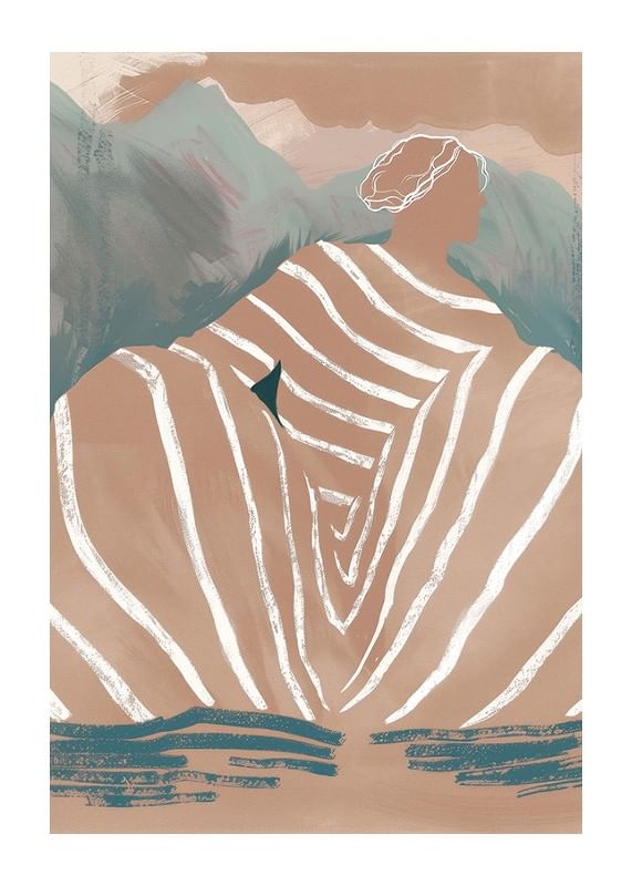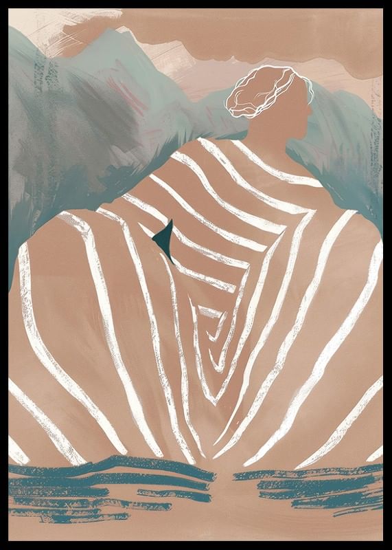 Discover the magic of this artwork where earthy tones meet elegant graphics. A mysterious silhouette takes shape against a backdrop of soft mountains and harmonious lines. This poster is a perfect balance of serenity and boldness, bringing a sense of sophisticated adventure to any room.