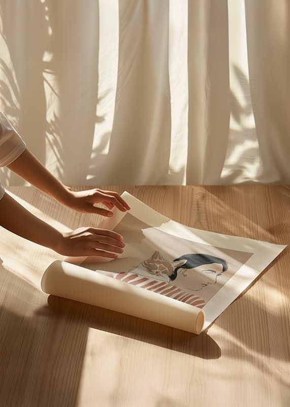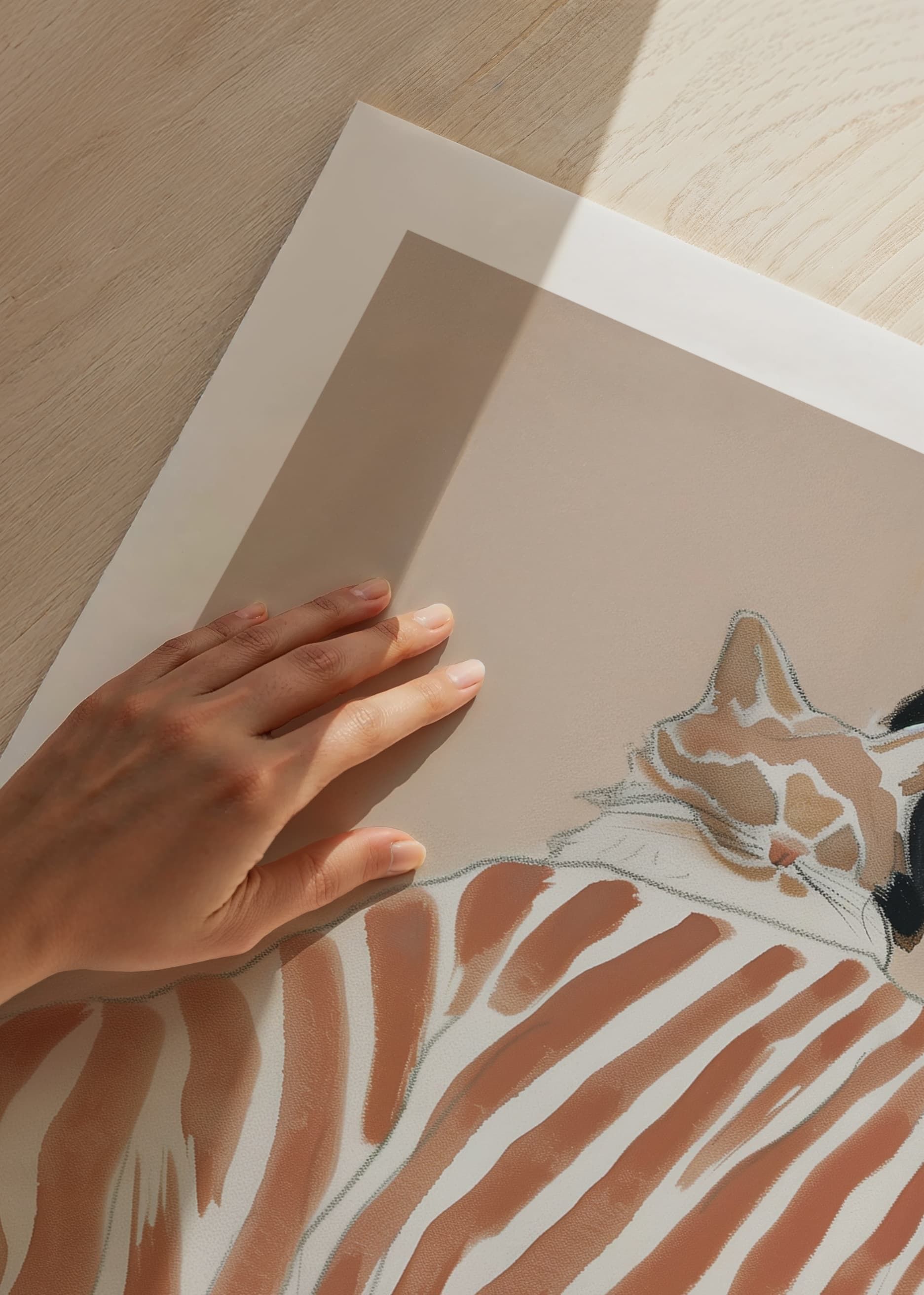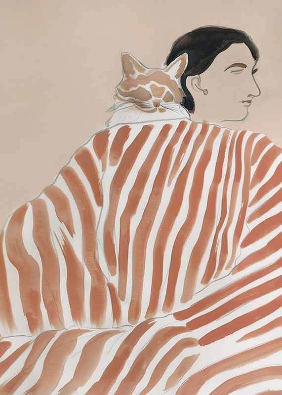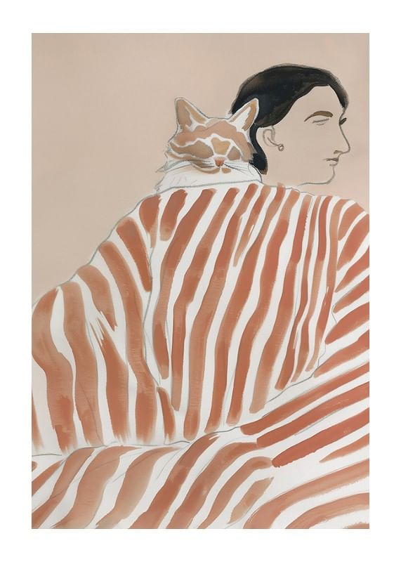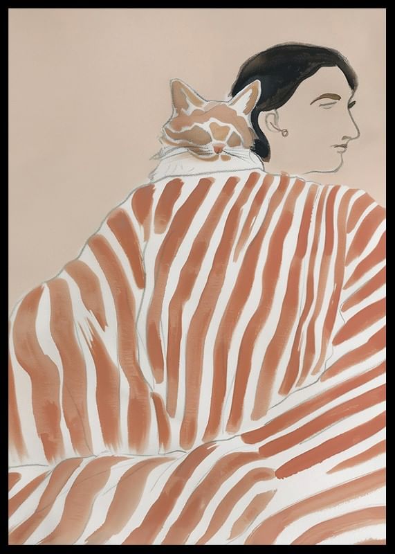 Discover a world of subtle elegance with this captivating poster, where a person and their cat harmonize in soft stripes of earthy tones. This illustration captures a moment of warm, quiet closeness, inviting reflection and tranquility.