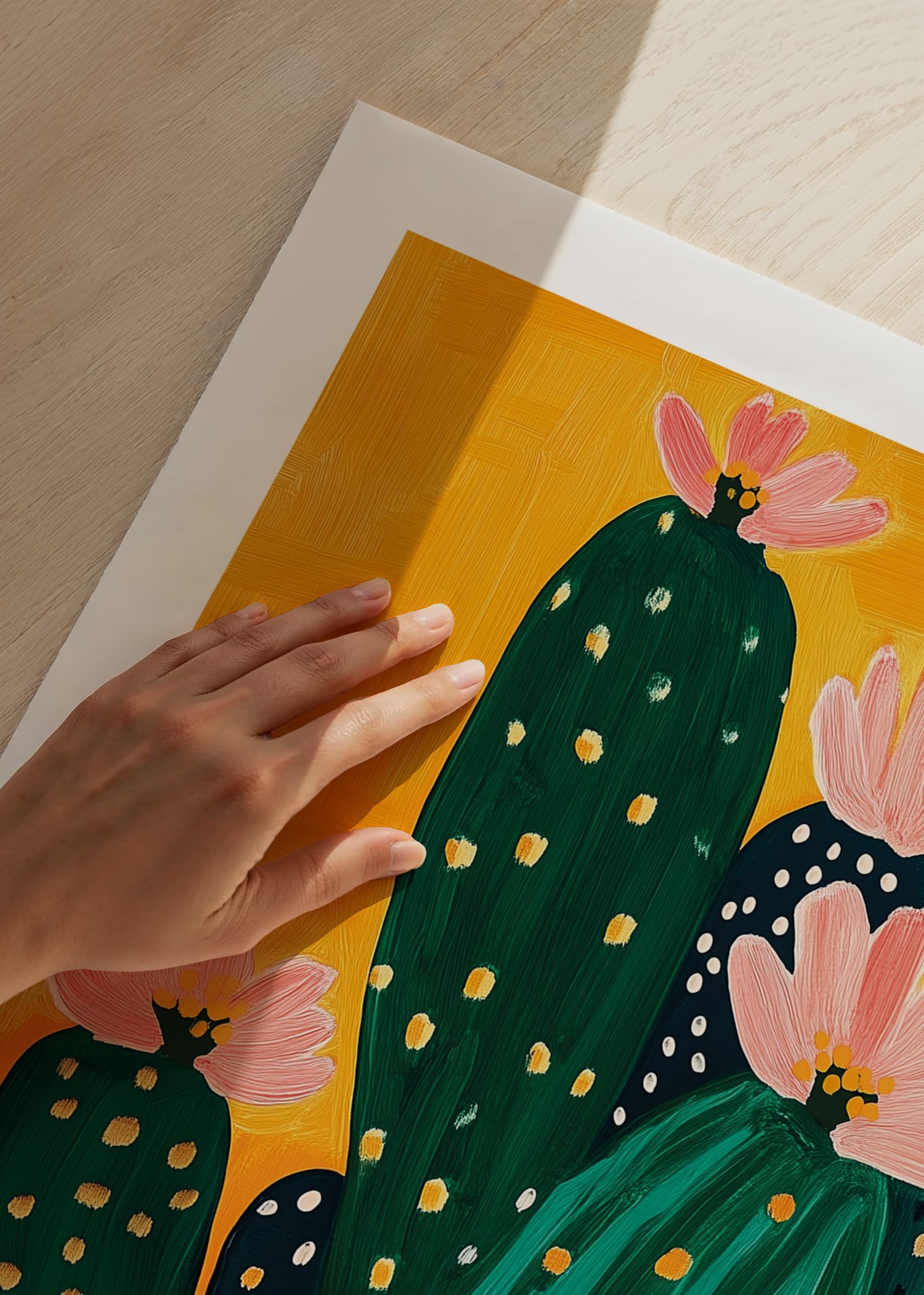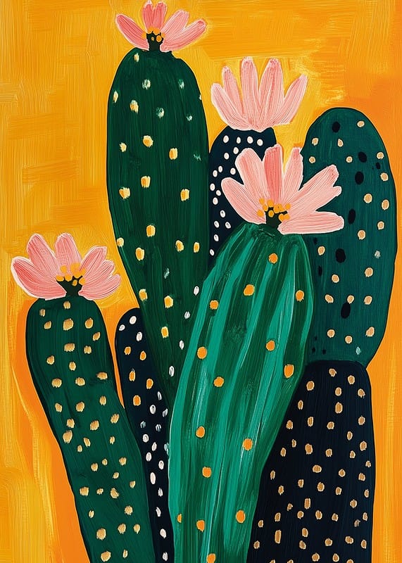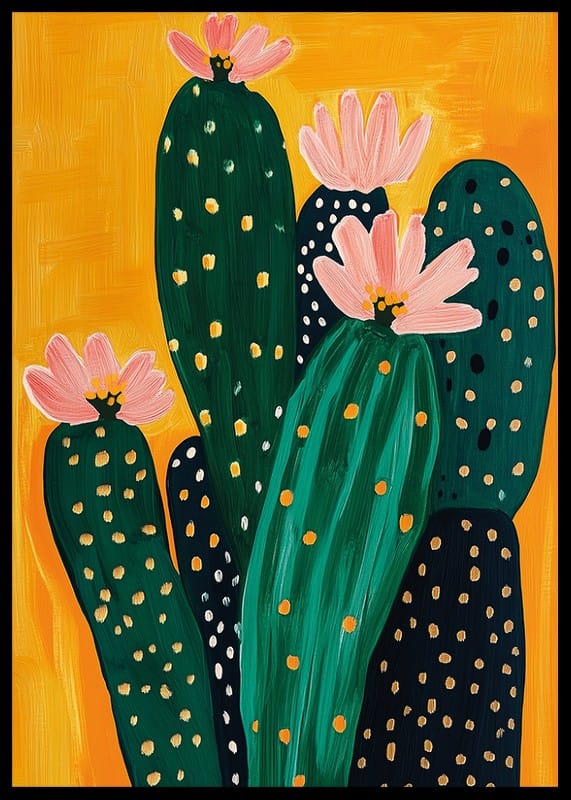 Fill your home with an explosion of color and life! This poster depicts vibrant green cacti against an energetic orange background, adorned with soft pink flowers. The golden dots give a sense of joy and discovery.