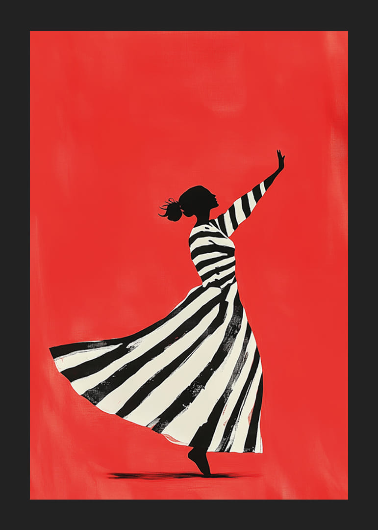 Experience the hypnotic elegance of this stunning poster, where a dancer's silhouette is captured in the midst of sweeping movement against a bold red background. The black and white dress and graceful pose symbolize freedom and expressiveness, creating a sense of movement and passion.