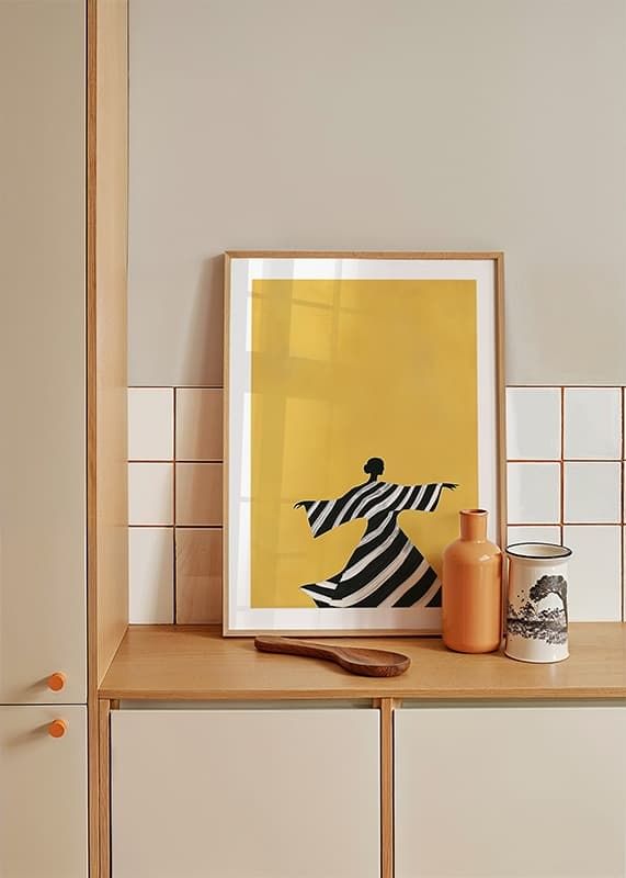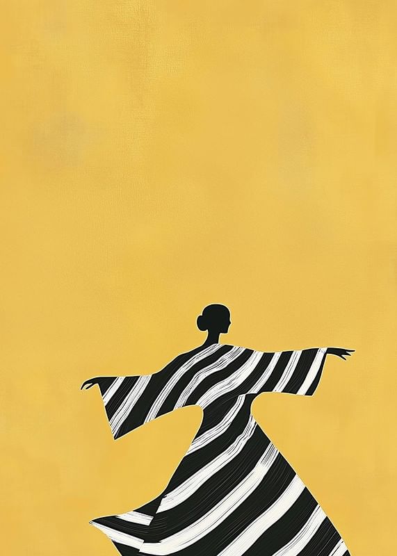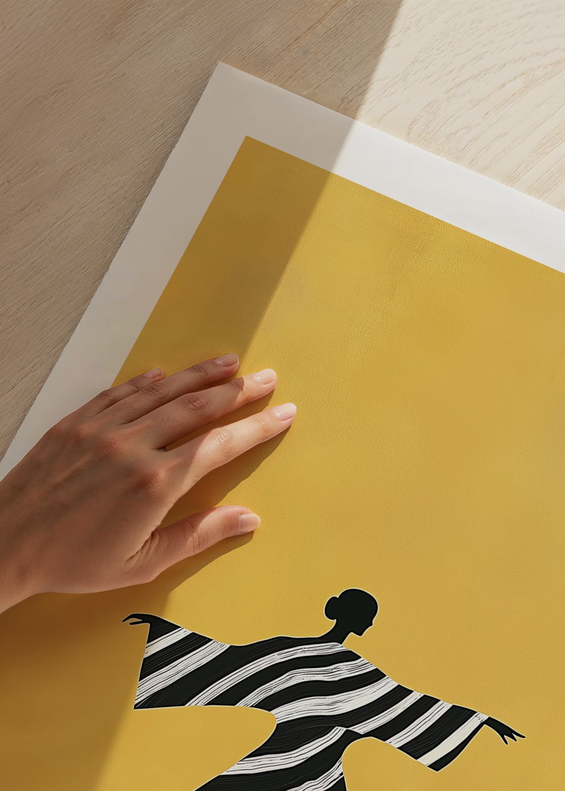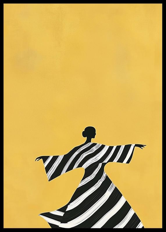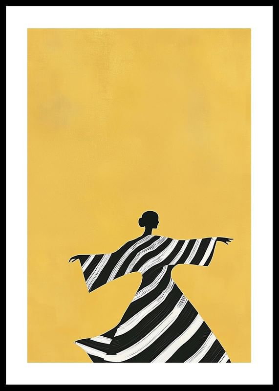 Capture the essence of movement and elegance with this stylish poster. Against a warm, golden background, a silhouette dressed in black and white striped fabric appears, embracing the room with its minimalist beauty.
