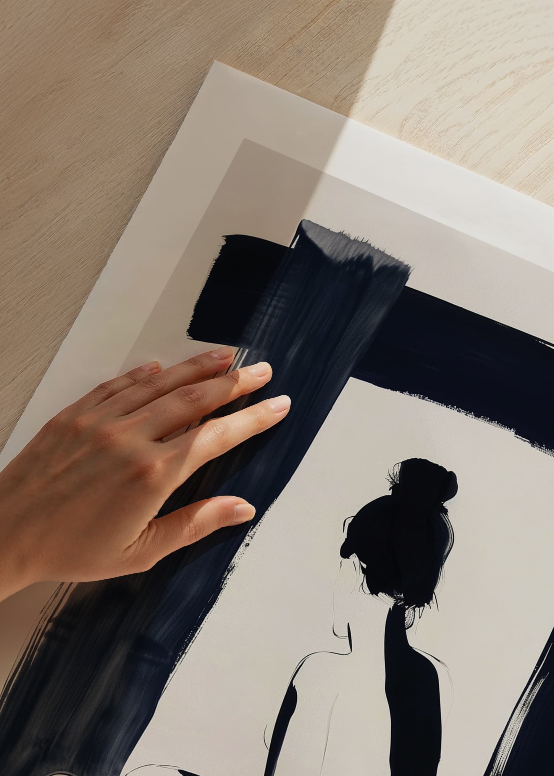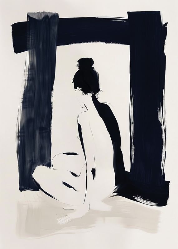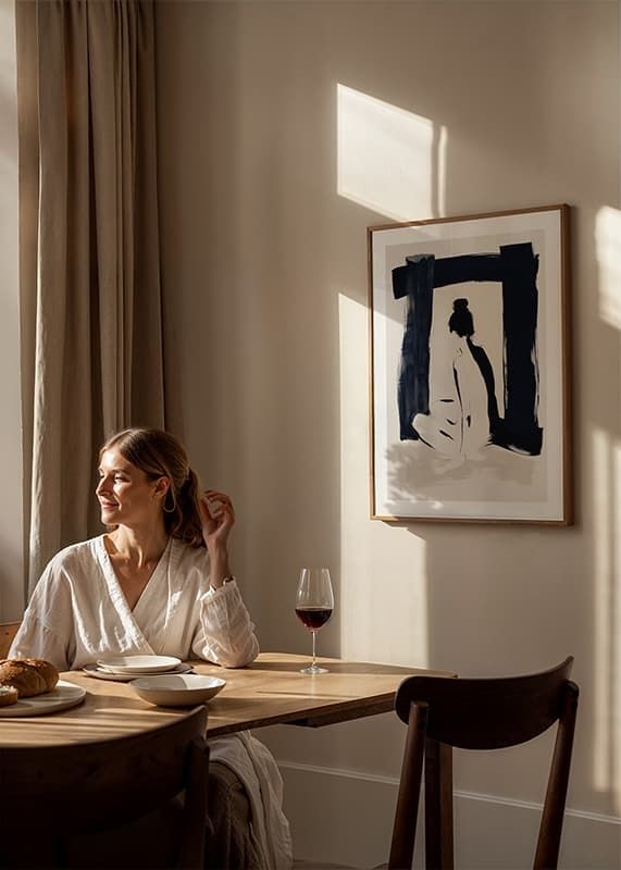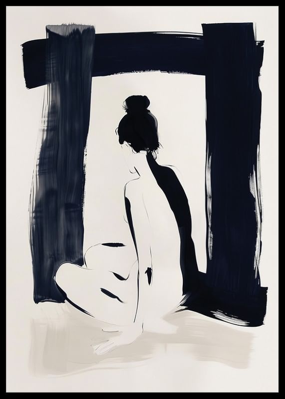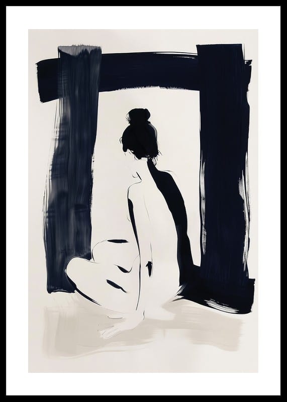 This poster captures an elegant silhouette in soft contrasts of black and white, creating a sense of stillness and introspection. Its simple yet powerful aesthetic gives the room a sophisticated and calm atmosphere.