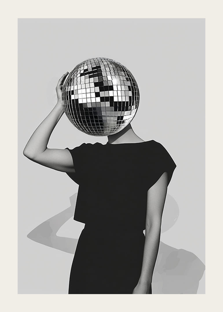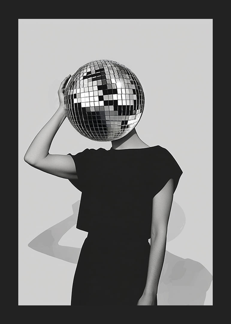 This poster catches the eye with its unique blend of mystery and elegance. A figure dressed in an elegant black dress wears a disco ball as a head, creating a fascinating contrast against the gray background.