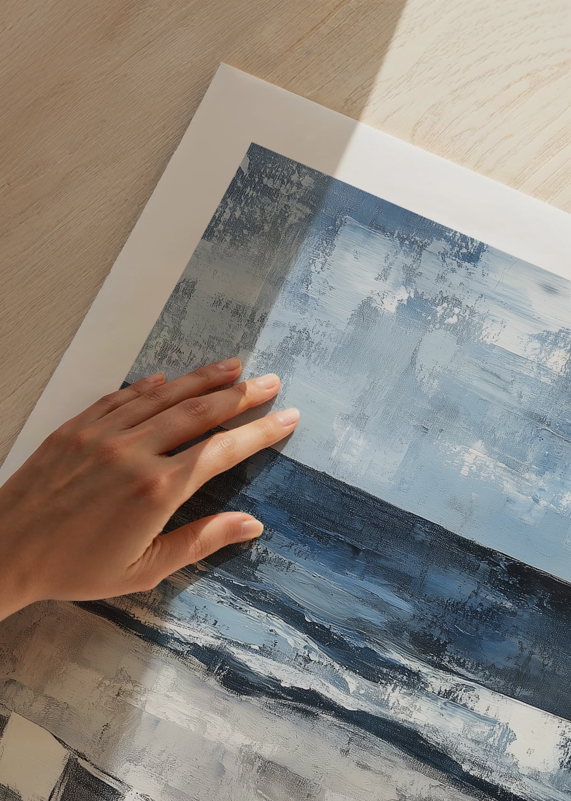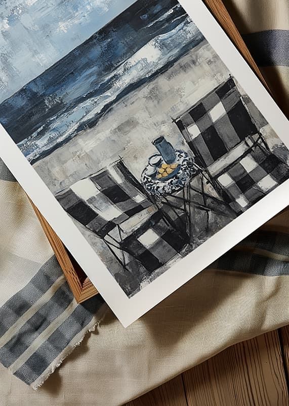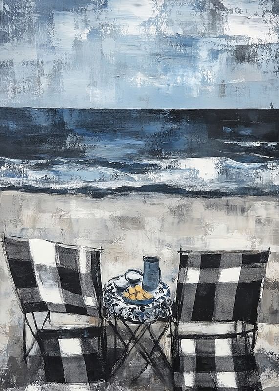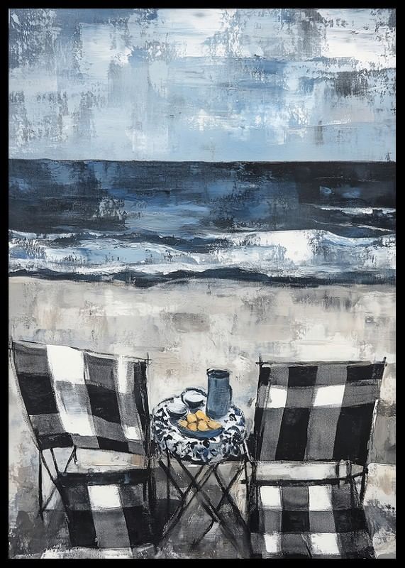 This poster captures a sense of calm with two chairs facing a dramatic ocean. The soft shades of blue and grey create a peaceful atmosphere, while the movement of the waves enhances the feeling of freedom.